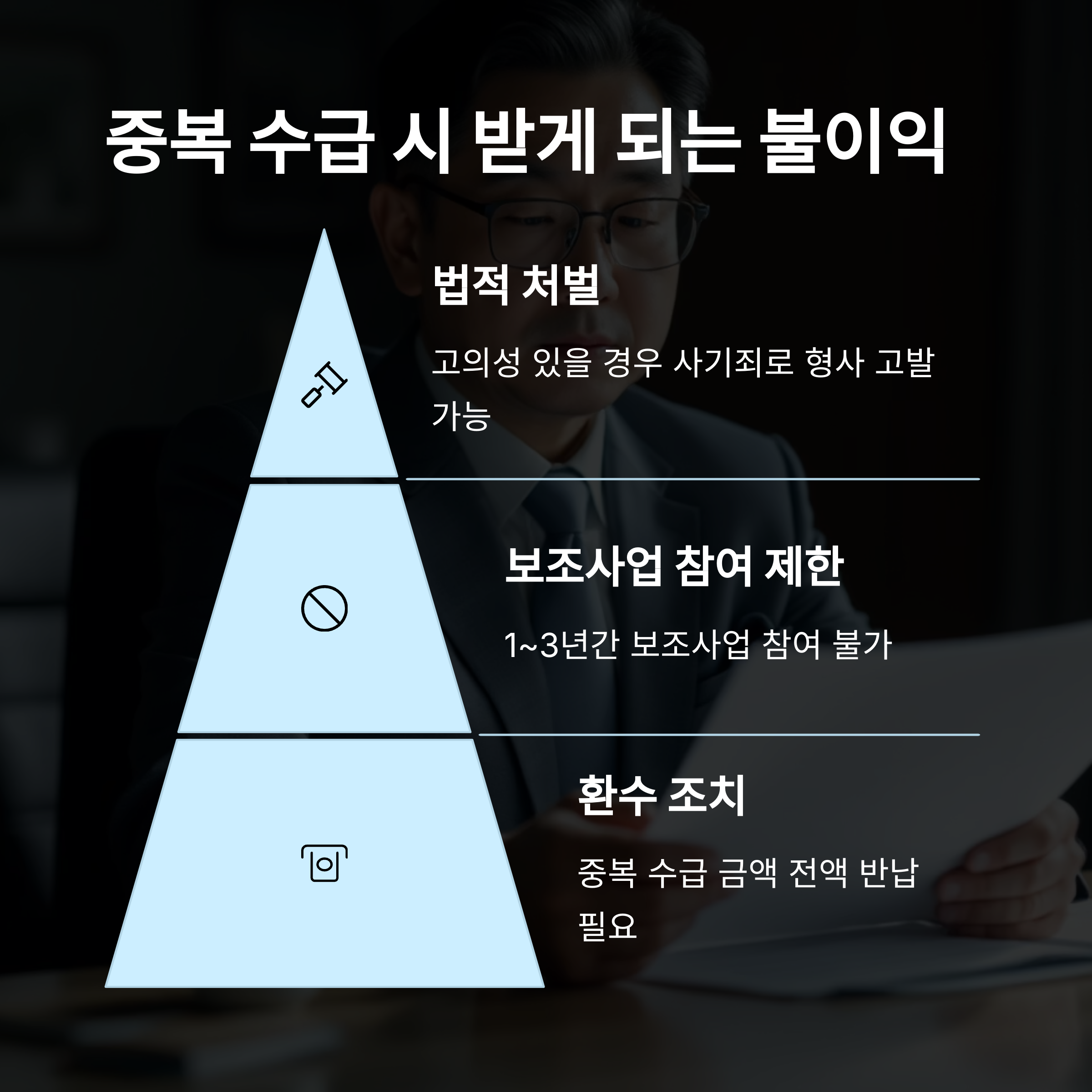 중복 지원이 확인되면 단순히 돈만 돌려주는 게 아니에요. 환수는 물론이고, 이후 보조금 신청 자체가 제한되기도 해요. 특히 고의성이 있다고 판단될 경우, 형사 처벌까지도 받을 수 있어요.