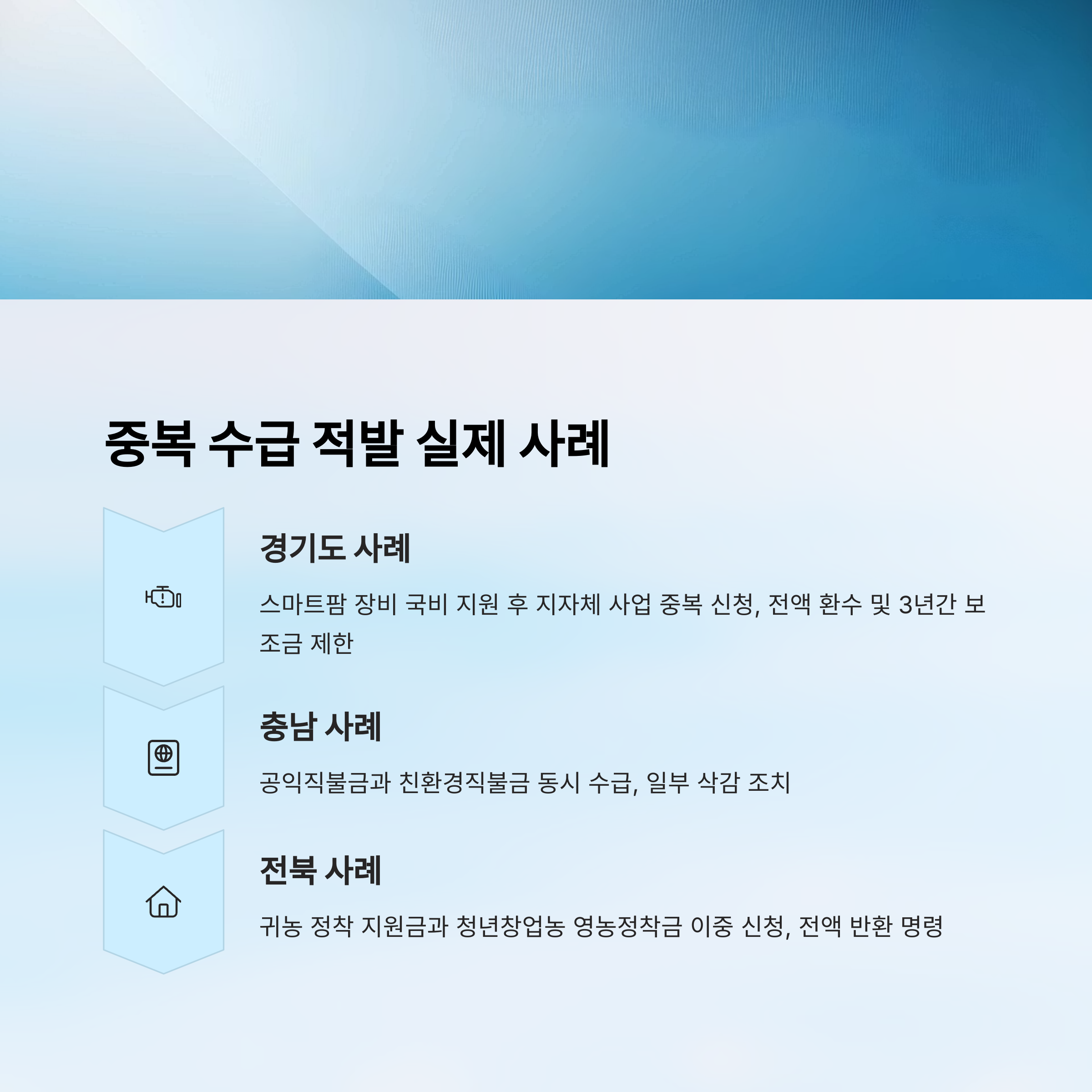 경기도의 한 농업인은 스마트팜 장비 지원을 국비로 받고, 비슷한 내용으로 지자체 사업에 또 신청했어요. 결국 이중 수급으로 확인돼서 두 번째 지원금은 전액 환수 조치되었고, 향후 3년간 보조금 신청도 제한받았어요.