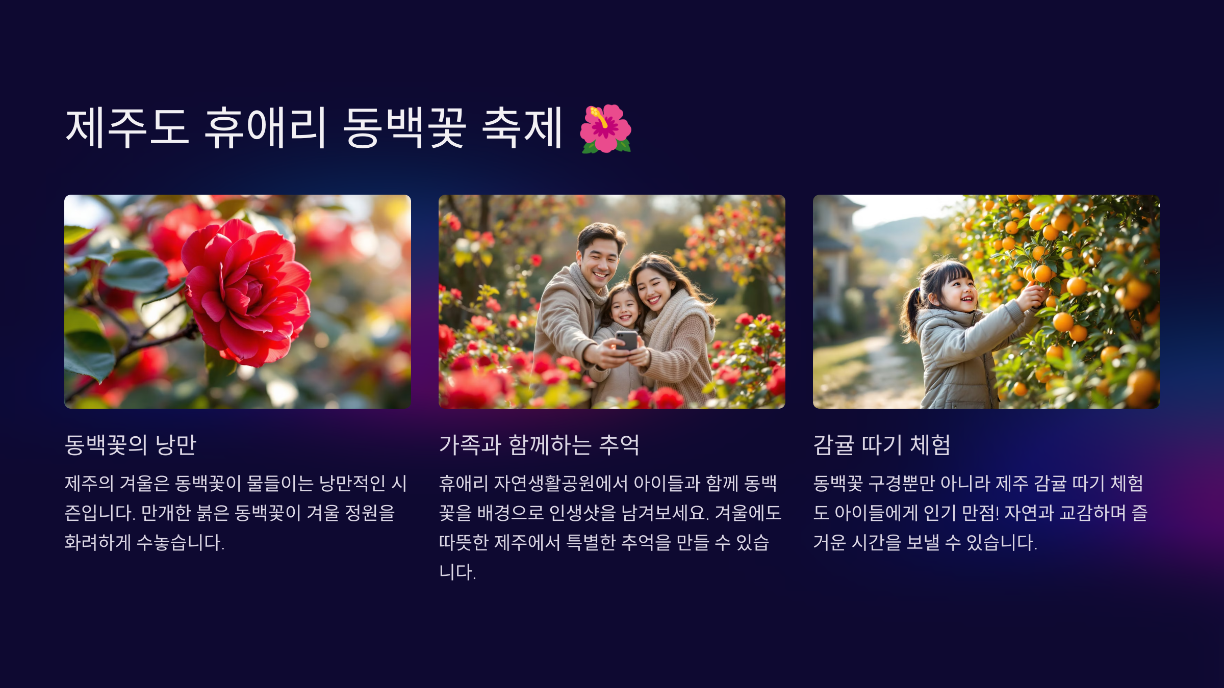 🌟 Tip: 동백꽃 축제 외에도 감귤 따기 체험이 아이들에게 인기입니다.