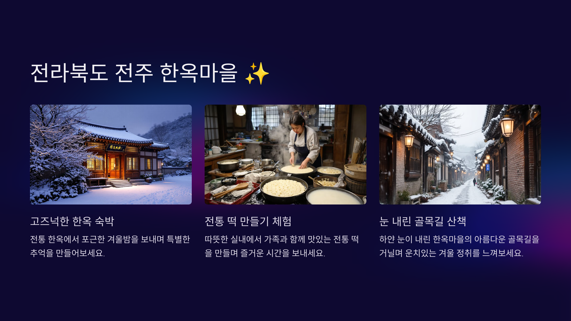 눈 내린 한옥마을은 고즈넉하면서도 아름답습니다. 한옥에서 숙박하며 전통 떡 만들기 체험에 참여하거나, 한복을 입고 눈 덮인 골목을 걸어보세요. 온 가족이 특별한 겨울의 추억을 만들 수 있어요.