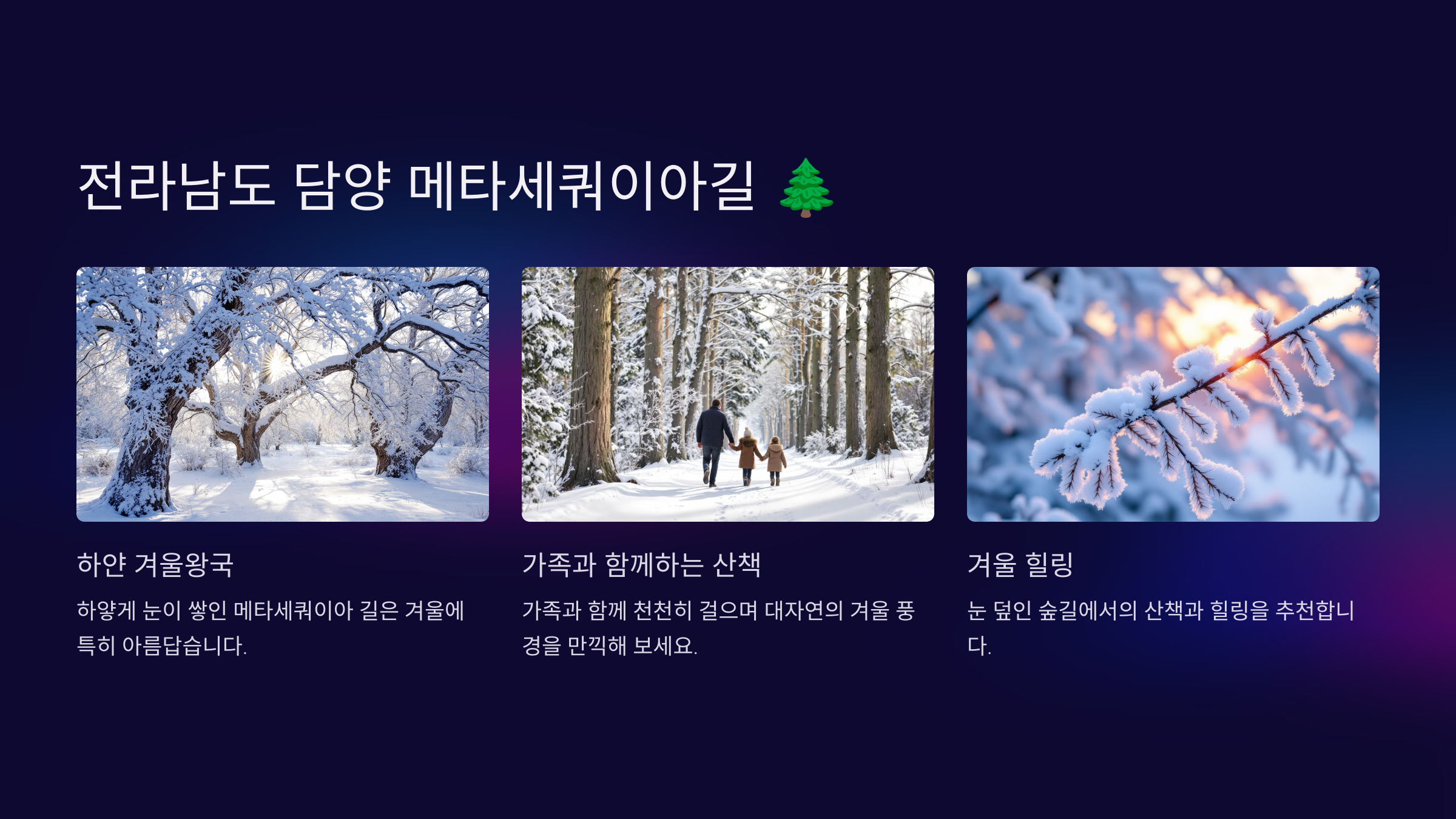 ✅ 추천 포인트: 눈 덮인 숲길에서의 산책과 힐링