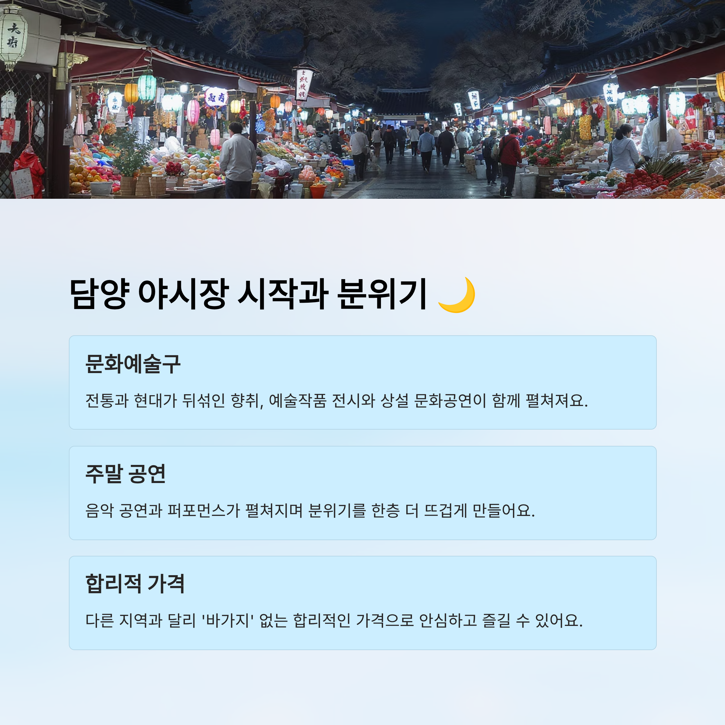 곧 이어서 담양 야시장의 시작과 분위기부터 교통, 셔틀, 추천 동선까지 전부 다 박스 형태로 정리해서 보여드릴 테니 안심하고 따라오시면 돼요. 아래부터 자동으로 자세한 섹션들이 차례대로 출력됩니다. 🚀