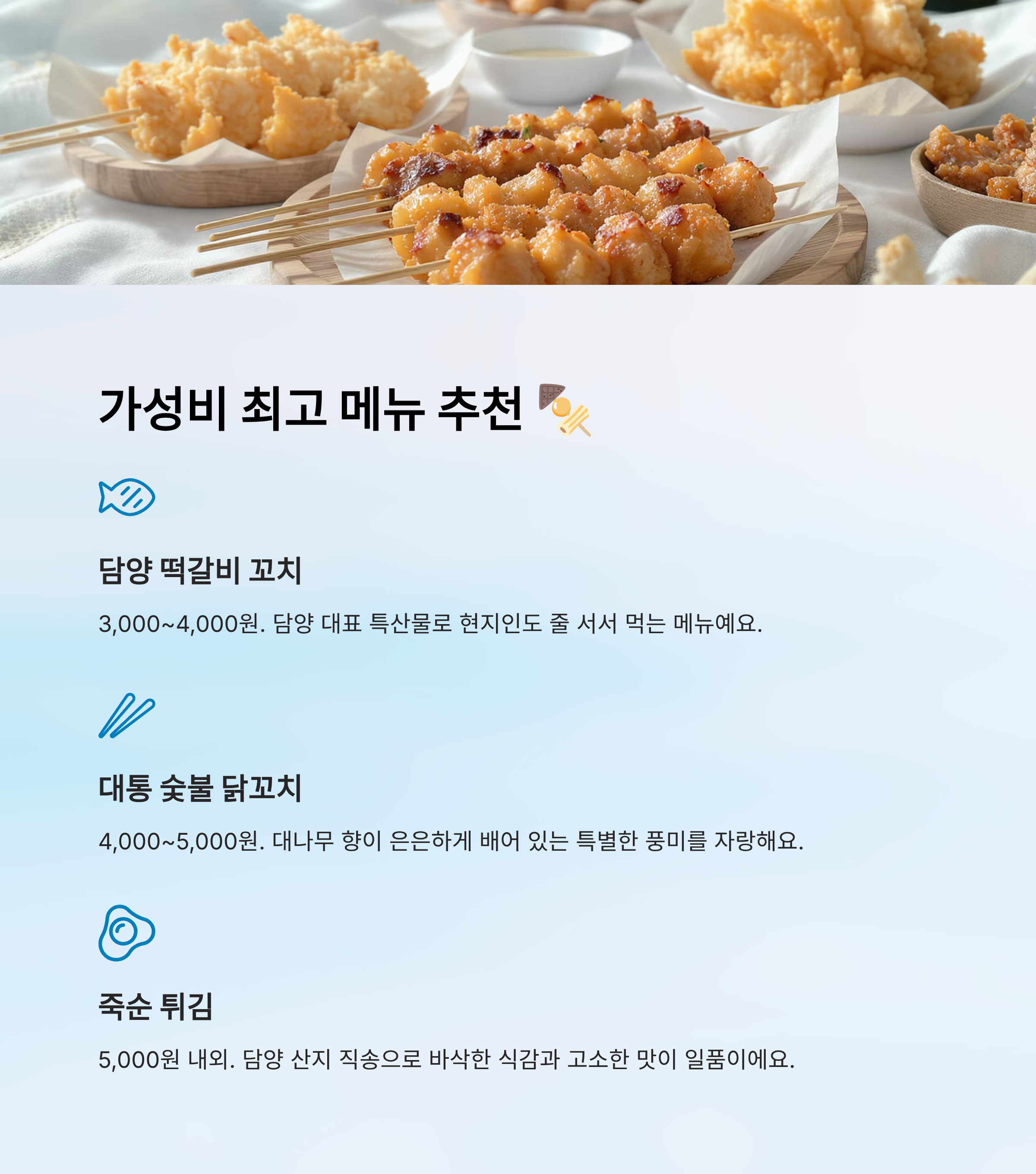 이 네 가지 메뉴만 기억해도 담양 야시장에서 최소 비용으로 최대 만족을 누릴 수 있어요. 실제로 여행자들 사이에서 "담양 야시장은 푸짐하고 저렴하다"는 평이 많은 이유가 바로 이런 가성비 메뉴들 덕분이랍니다. 🍡