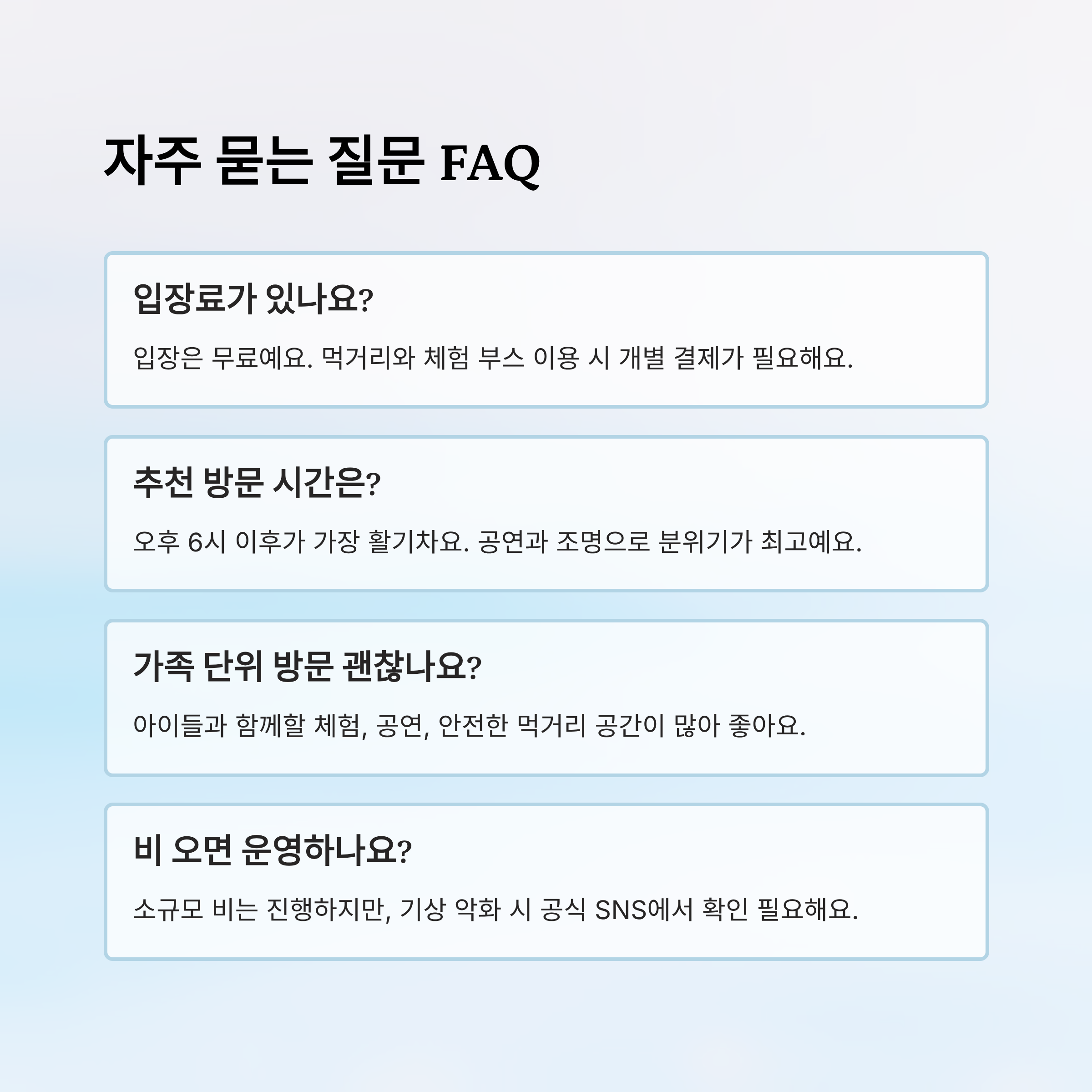 A8. 소규모 비는 진행하지만, 기상 악화 시 일부 부스 운영이 중단될 수 있어요. 당일 운영 여부는 공식 SNS에서 확인해야 해요.