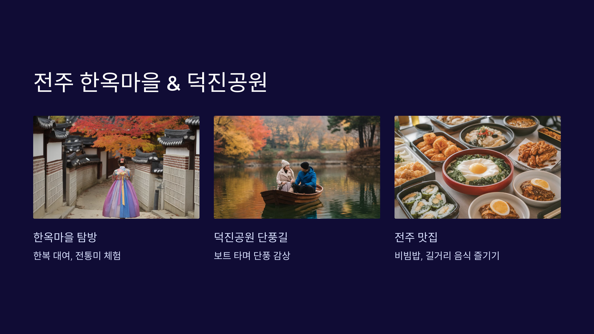 전주는 한국 전통미와 가을의 정취를 동시에 즐길 수 있는 여행지입니다. 전주한옥마을의 고즈넉한 분위기와 덕진공원의 단풍길 산책은 완벽한 가을 여행 코스입니다. - 코스 추천: