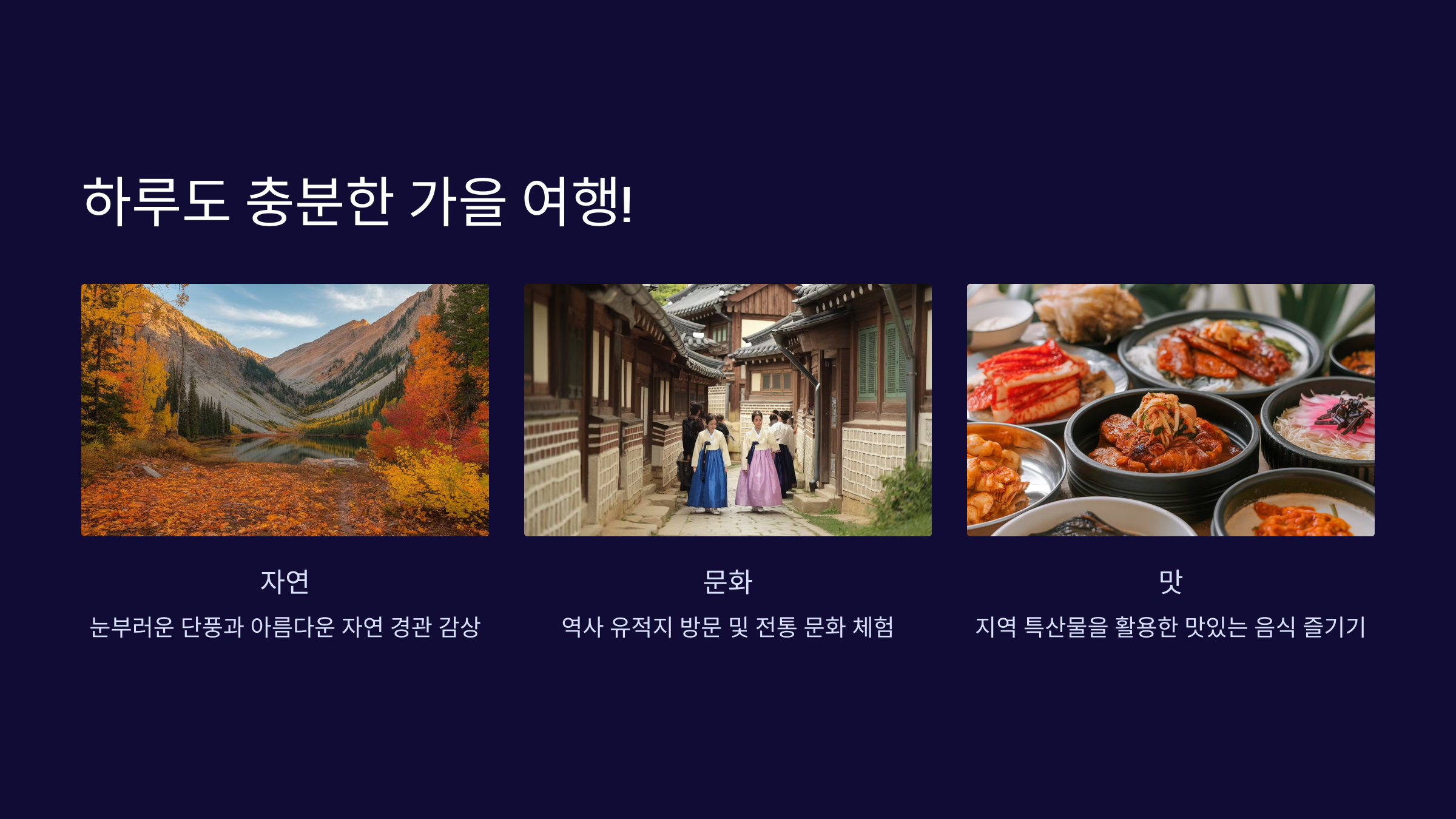 가을의 아름다움을 만끽하기 위해 멀리 떠날 필요는 없습니다. 위에서 소개한 당일치기 가을 여행 코스를 참고해 짧은 시간 안에 알차게 힐링해 보세요. 자연, 맛, 문화가 어우러진 완벽한 하루가 여러분을 기다리고 있습니다. 😊🍁