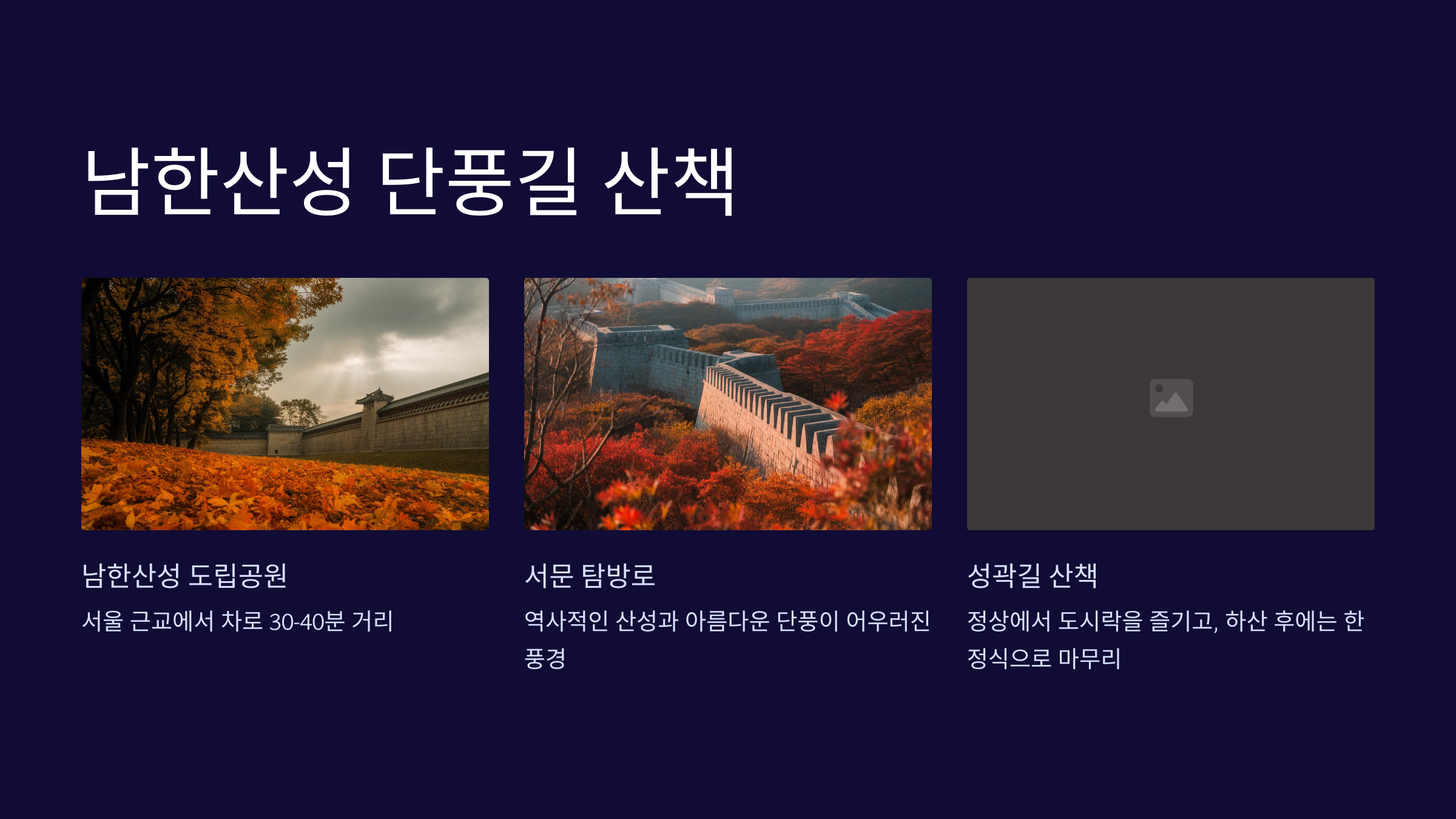남한산성은 서울에서 가까우면서도 단풍 명소로 손꼽히는 곳입니다. 역사적인 산성과 가을 단풍이 어우러진 풍경은 걷는 것만으로도 힐링을 선사합니다. - 코스 추천: