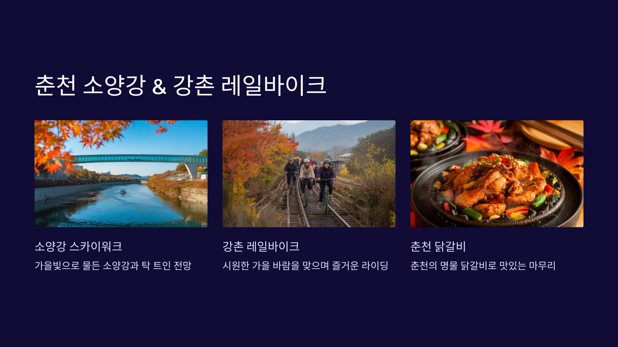 춘천은 강과 산이 어우러진 풍경이 매력적인 도시입니다. 소양강 스카이워크에서 탁 트인 강을 감상한 후, 강촌 레일바이크를 타고 가을 바람을 맞으며 즐거운 시간을 보낼 수 있습니다. - 코스 추천: