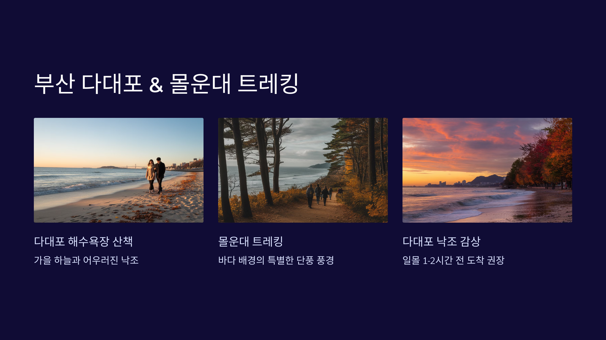 부산 다대포 해수욕장은 가을 하늘과 어우러지는 낙조로 유명한 곳입니다. 근처 몰운대는 바다를 배경으로 단풍이 드는 특별한 풍경을 즐길 수 있는 트레킹 코스입니다. - 코스 추천: