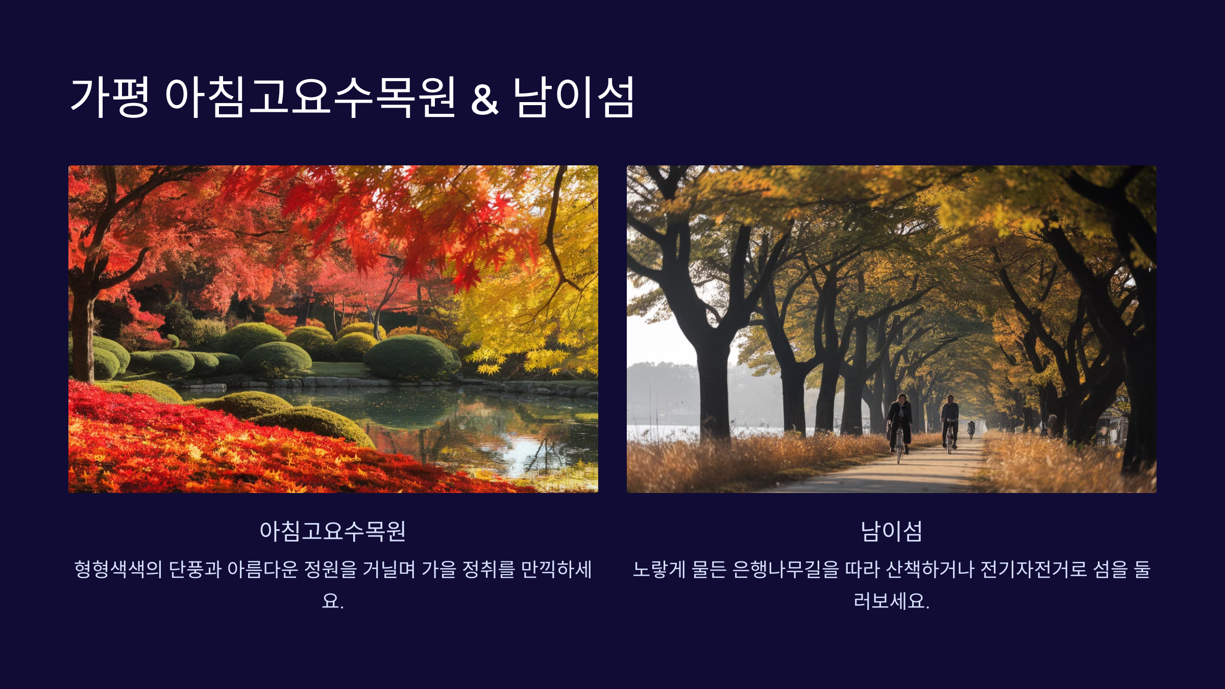 가평은 수도권에서 당일치기로 다녀오기 좋은 여행지입니다. 아침고요수목원의 단풍과 남이섬의 은행나무길은 가을의 정취를 제대로 느낄 수 있는 대표 코스입니다. - 코스 추천: