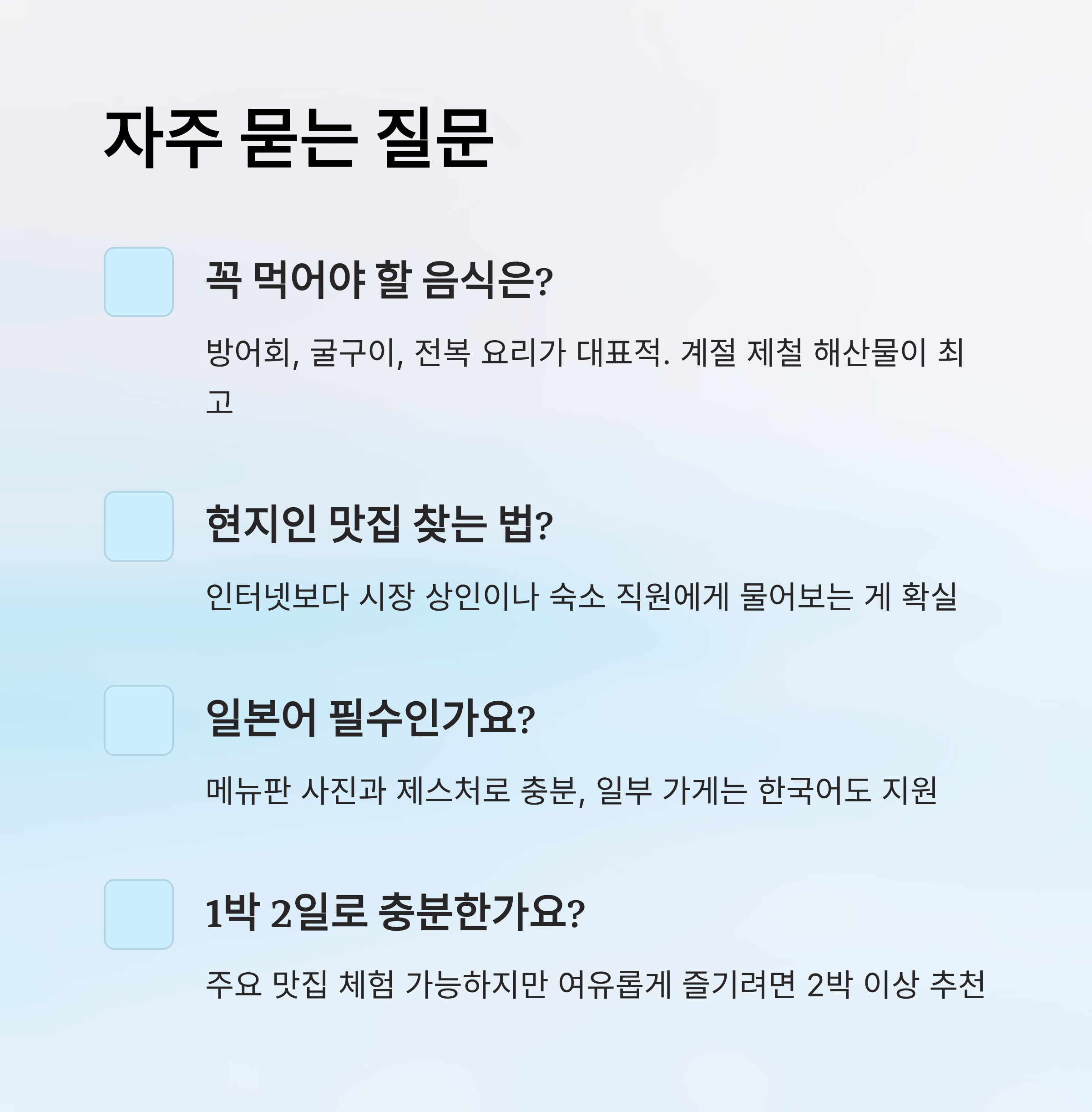 A5. 일본어를 몰라도 큰 문제는 없어요. 메뉴판에는 사진이 있는 경우가 많고, 일부 가게는 한국어도 지원해요.