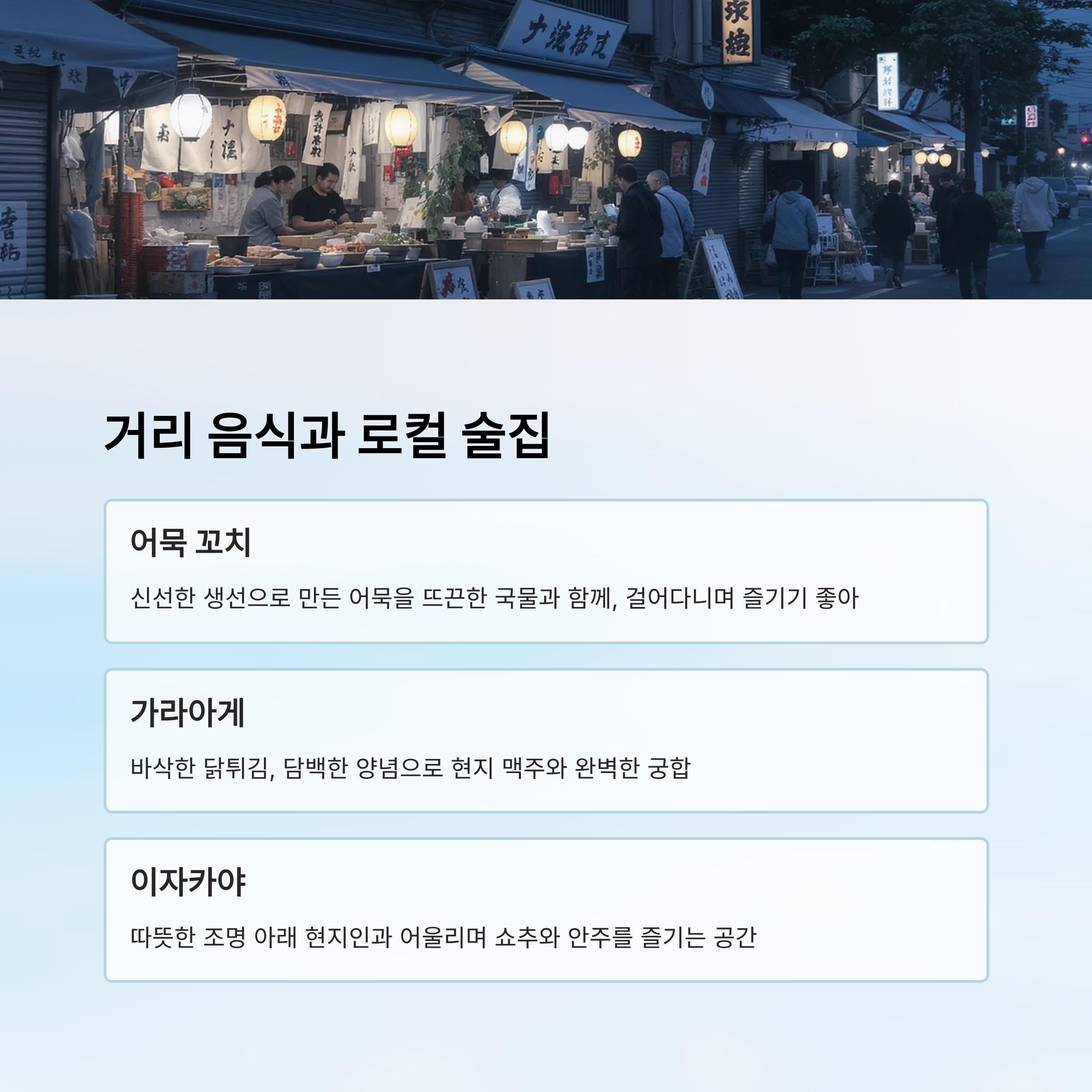 | 거리 음식 | 가라아게 | 담백하고 바삭 | 오후~밤 | 맥주 안주로 인기 |