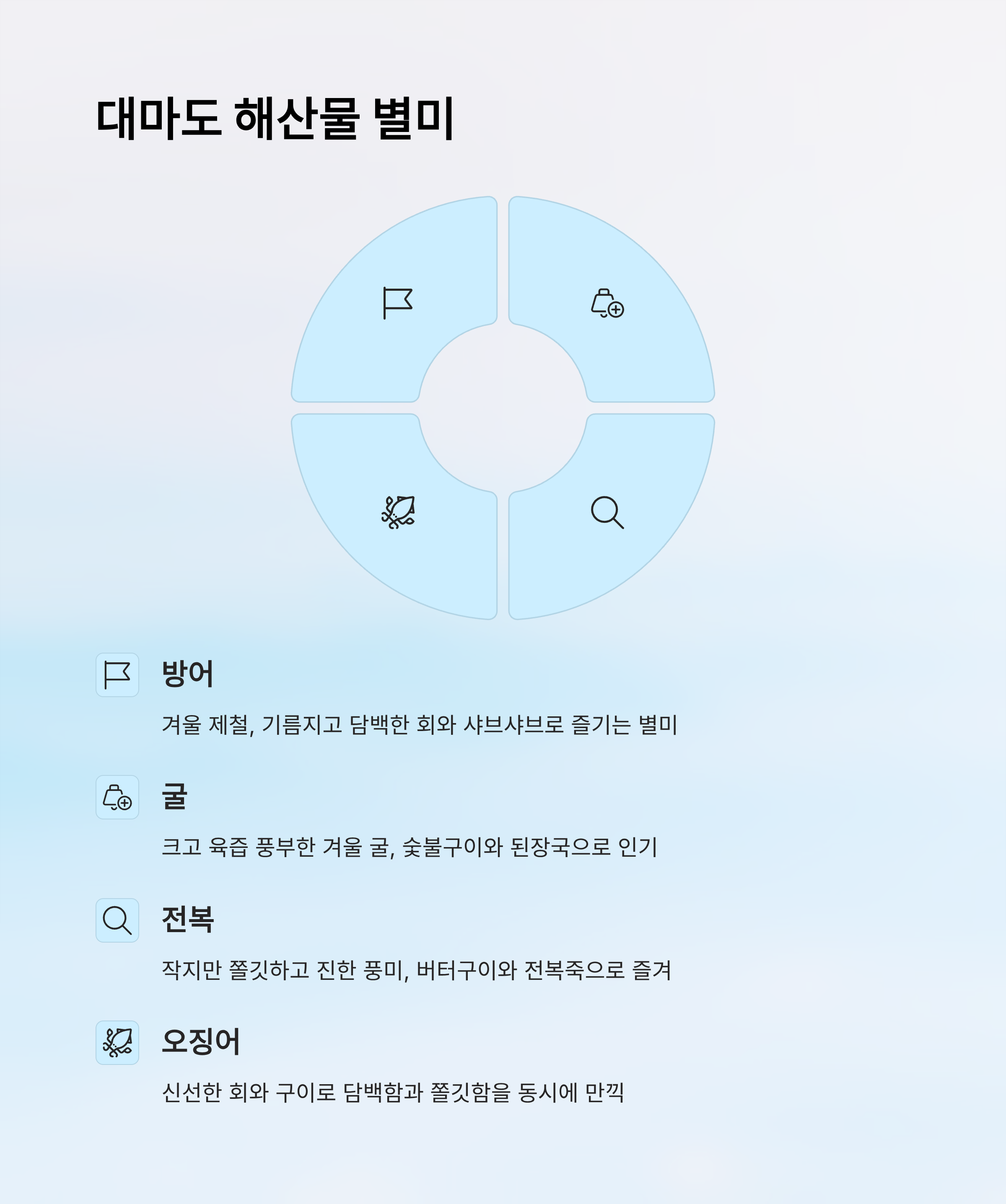 | 오징어 | 회, 구이 | 쫄깃하고 담백 | 여름~가을 | 회, 안주 |