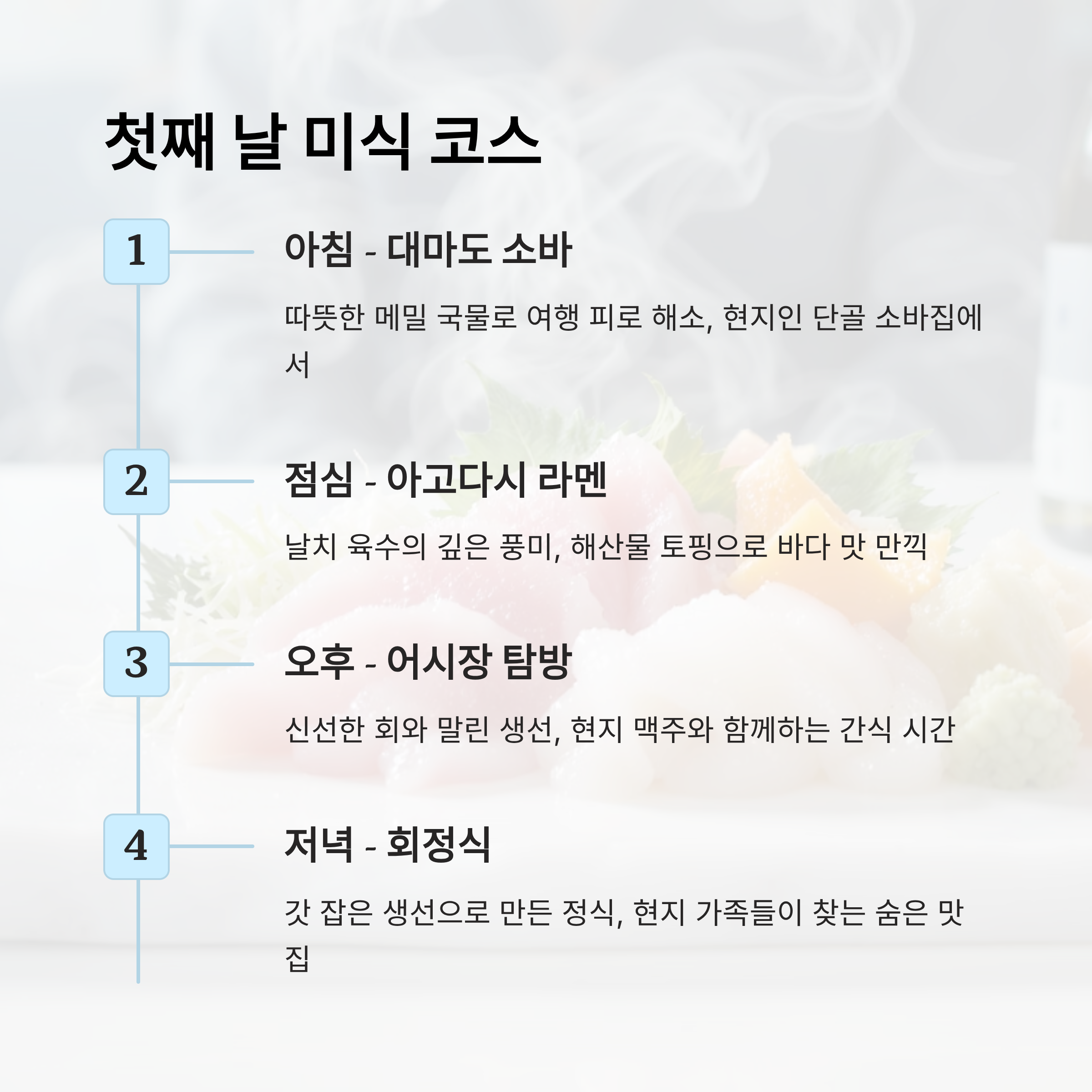 첫째 날의 여정은 아침부터 밤까지 완벽하게 이어져 있어요. 아침의 담백한 소바로 시작해, 점심의 깊은 라멘, 오후 시장 간식, 저녁 회정식과 술집 탐방까지 이어지는 코스는 대마도의 미식 세계를 압축해 보여주죠. 이 흐름을 따르다 보면, 단순히 먹는 여행이 아니라 현지인의 하루를 함께 살아보는 경험을 하게 돼요.
