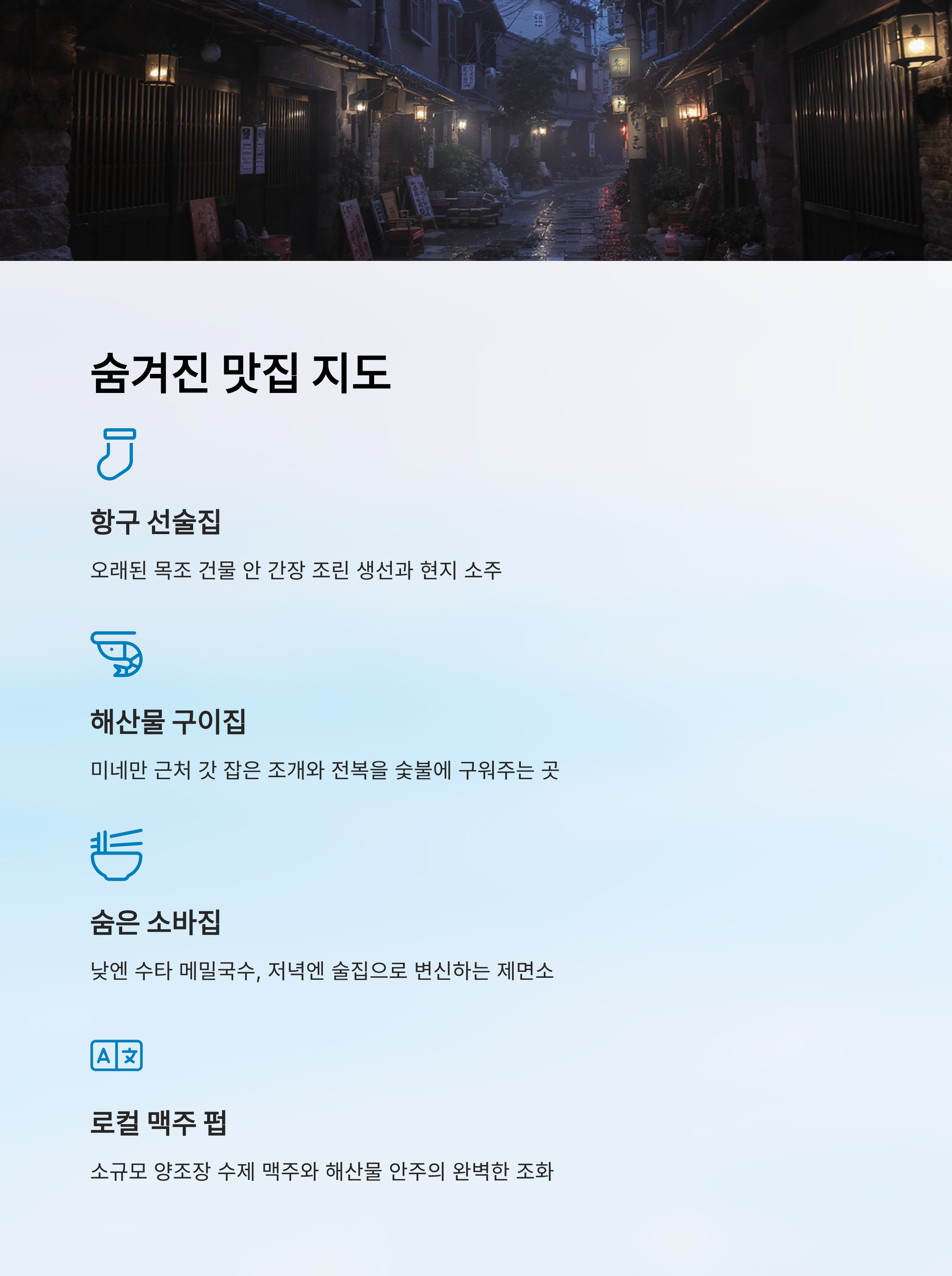 | 밤 | 소주와 안주 | 골목 이자카야 | 현지 소주와 어울리는 해산물 | ★★★★☆ |