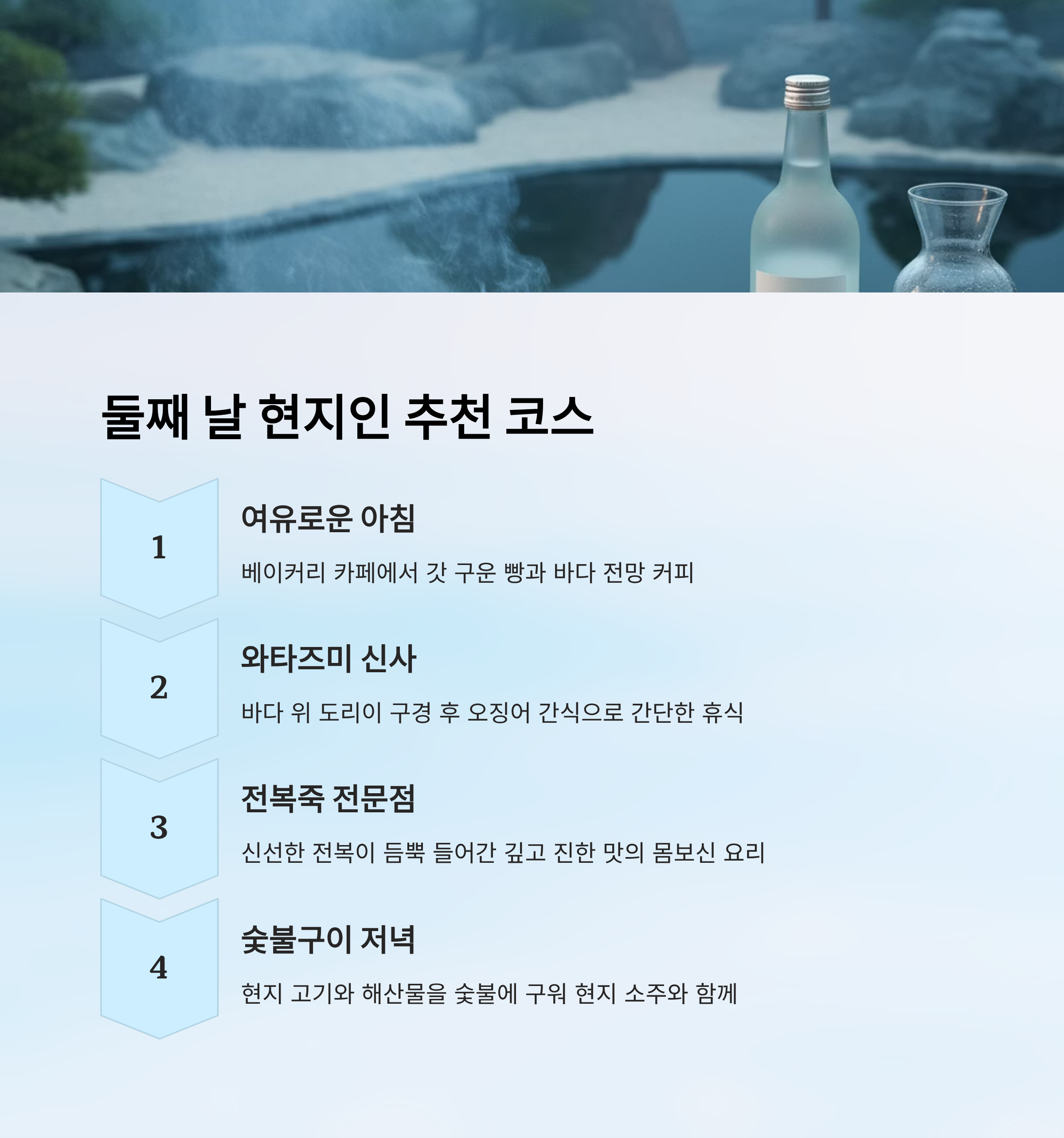 이 코스를 그대로 따라가면 하루가 순식간에 지나가지만, 그만큼 밀도 있는 경험을 할 수 있어요. 아침의 따뜻함, 점심의 풍성함, 저녁의 신선함, 그리고 밤의 즐거움까지 모두 담긴 첫째 날은 대마도의 매력을 충분히 보여줘요. 🍶