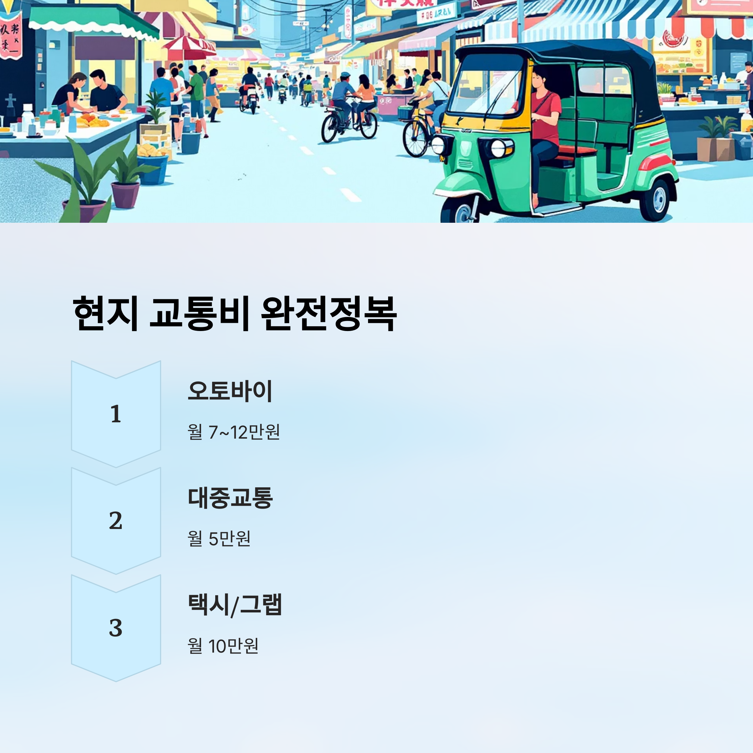 두 번째는 교통비 절약! 그랩보다는 대중교통, 그리고 오토바이를 직접 렌트하는 게 훨씬 저렴해요. 기본적인 교통비만 아껴도 한 달 동안 수십 번 이용하게 되니까 차이가 커요.