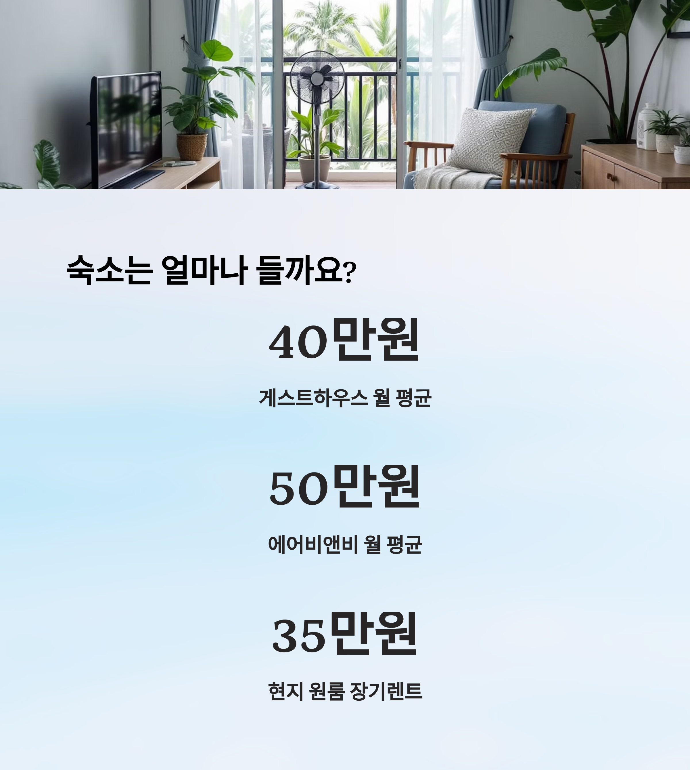 | 발리(인도네시아) | 500,000 ~ 700,000 | 쉐어빌라 | 자연 속 힐링에 최적 |