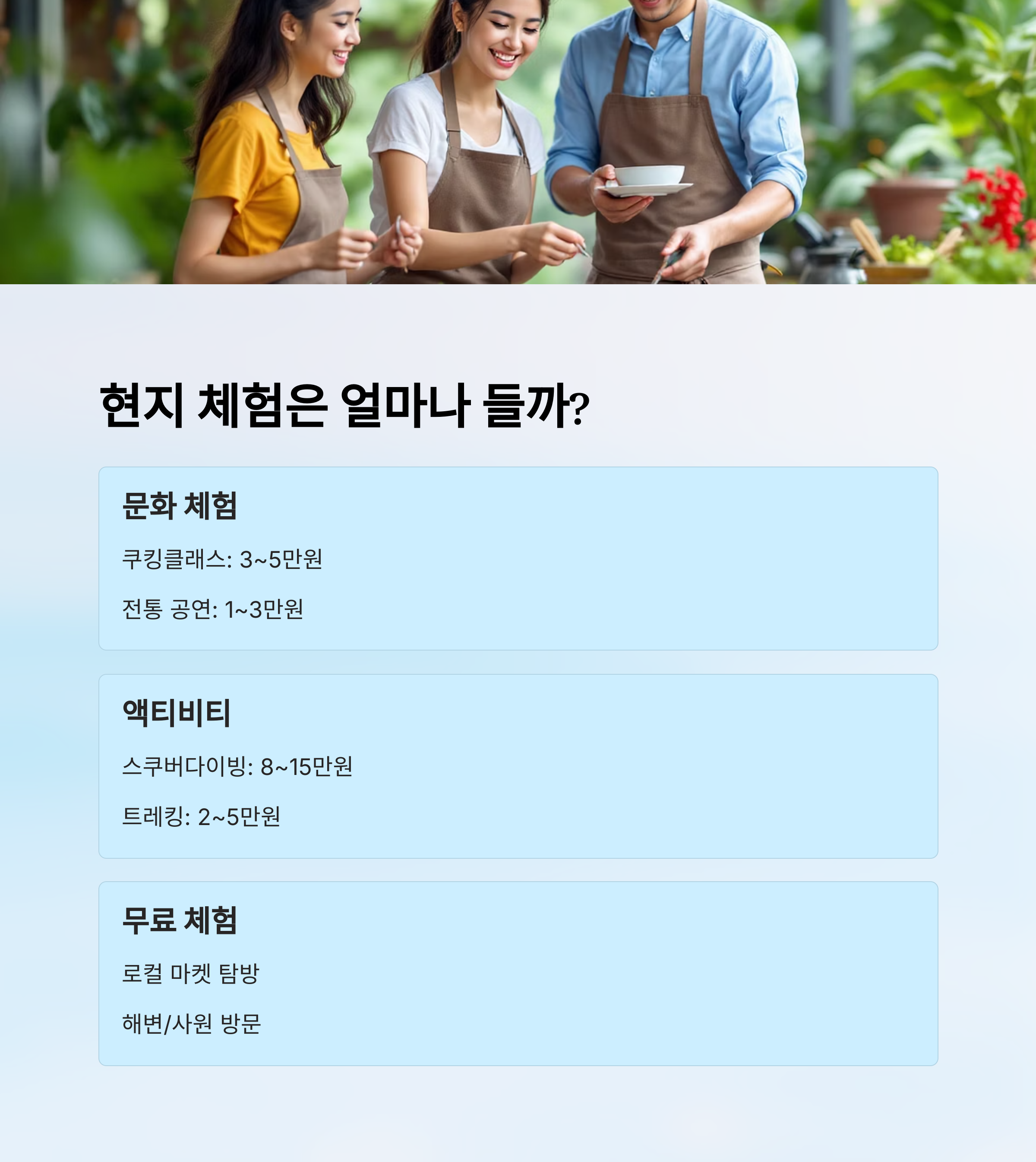베트남 다낭에서는 바나힐이나 호이안 야경 투어, 쿠킹 클래스가 인기고요. 태국 치앙마이에서는 코끼리 보호소 체험, 산악 트래킹 등이 유행이에요. 체험비는 보통 1만 원~3만 원 사이고, 투어는 5만 원 안팎으로 생각하면 돼요.