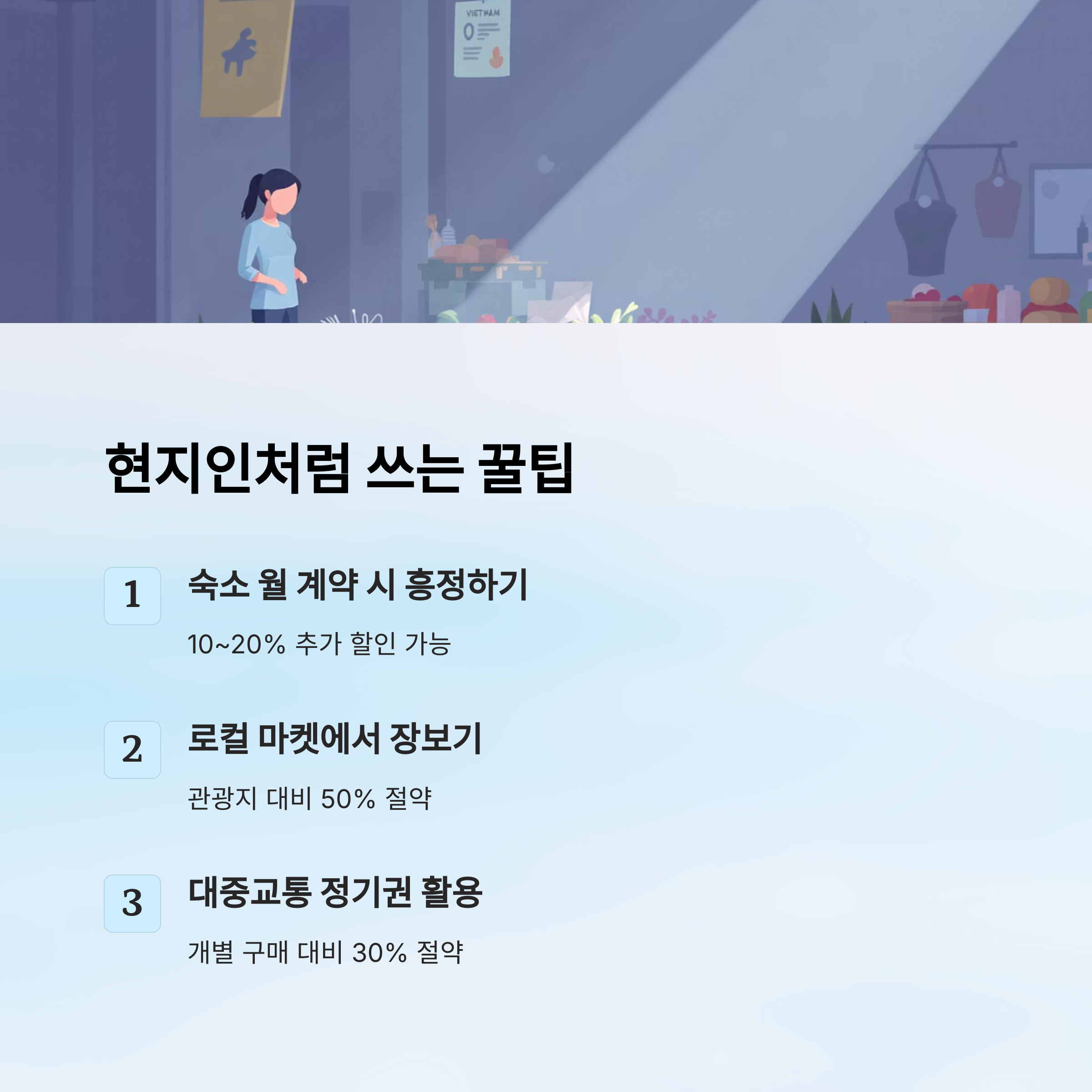 세 번째는 식비 절약이에요. 현지 시장에서 장 보고 간단한 요리만 해도 훨씬 저렴하게 살 수 있어요. 쌀국수나 볶음밥은 숙소에서 간단하게 만들 수 있고, 커피도 직접 내려 마시면 비용이 반으로 줄어요!