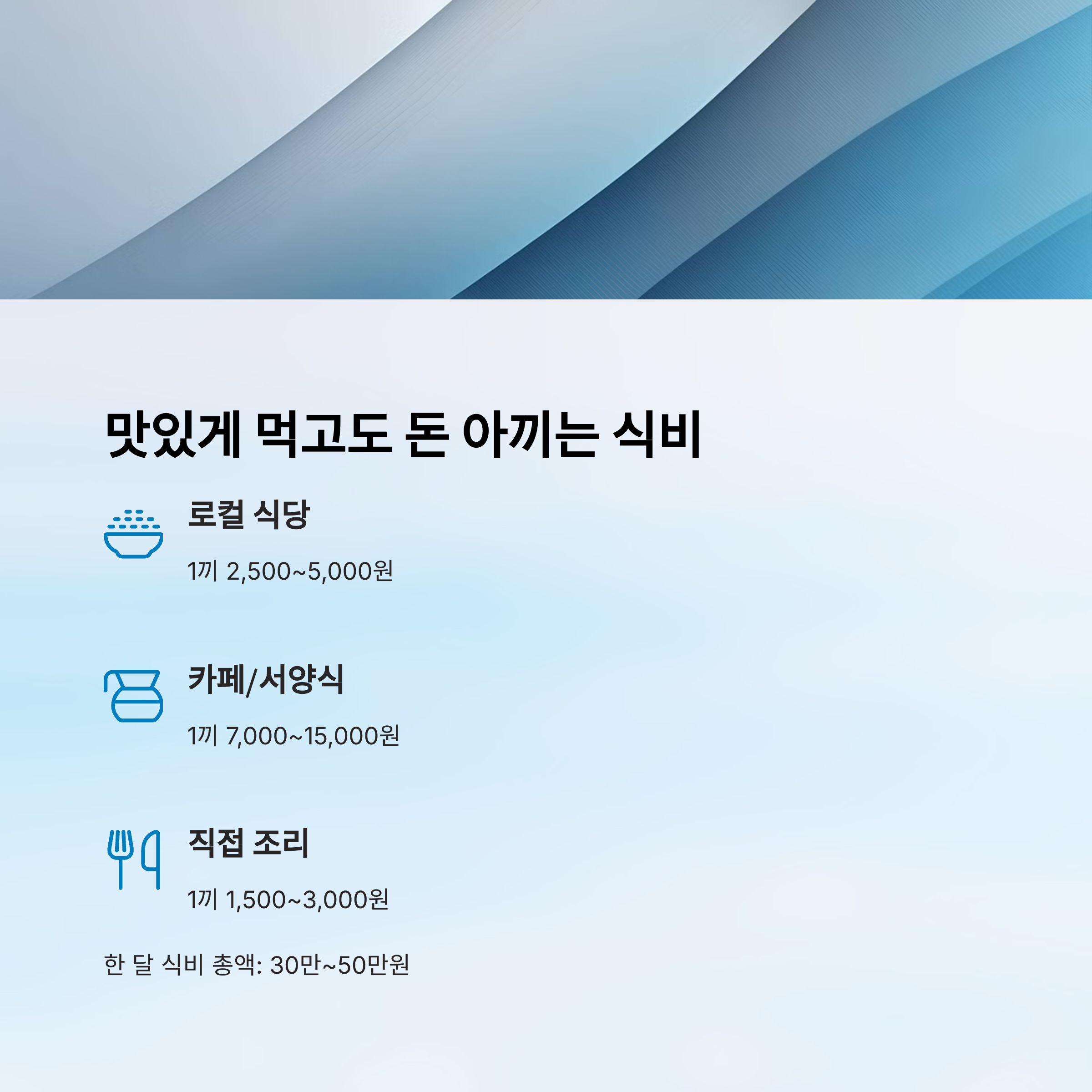 | 식비 | 150,000 ~ 300,000 | 로컬푸드 위주 식사 |