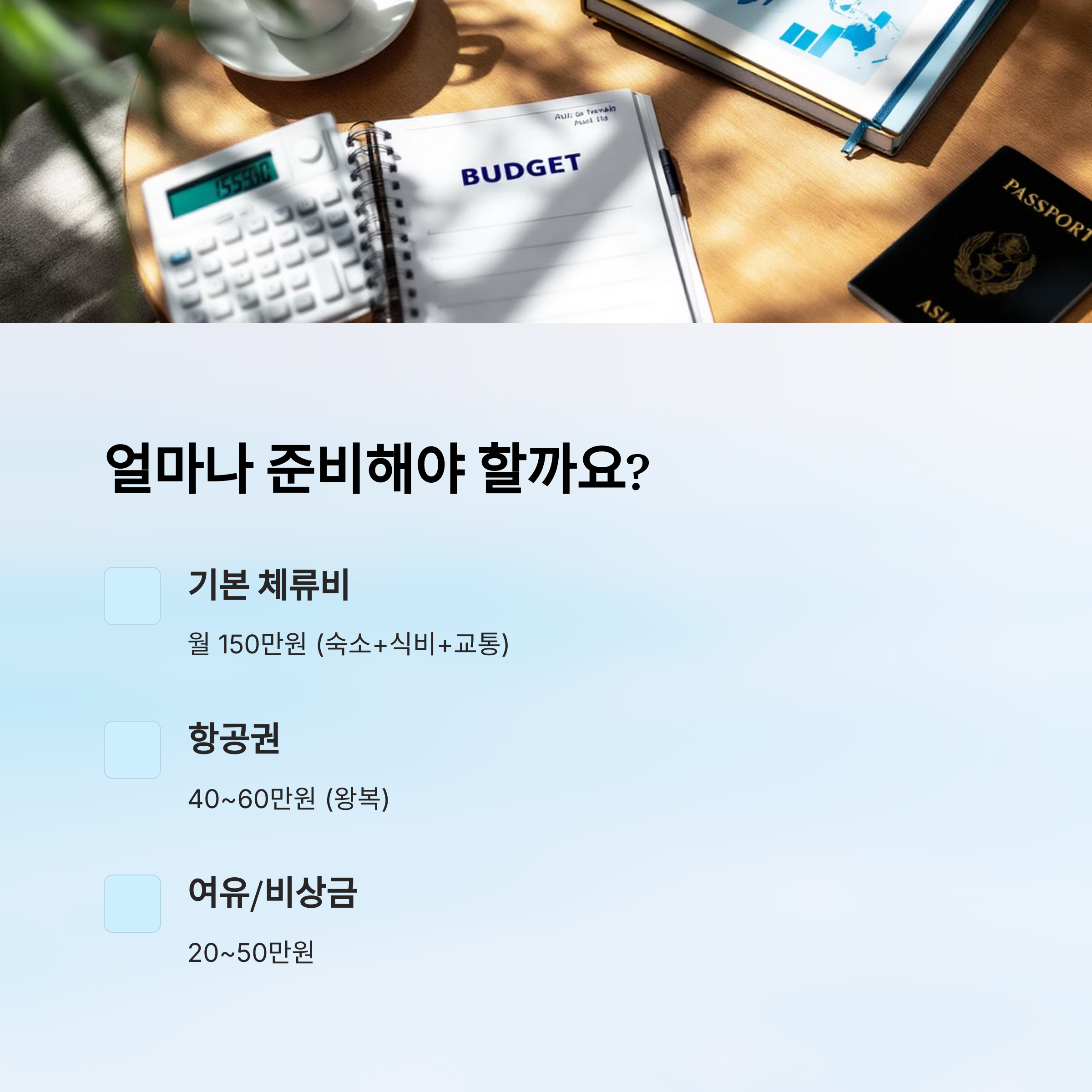A1. 1인 기준 평균 100만~150만 원 정도면 충분해요. 숙소, 식비, 교통, 체험비를 포함한 금액이에요. 생활 스타일에 따라 조정 가능해요!
