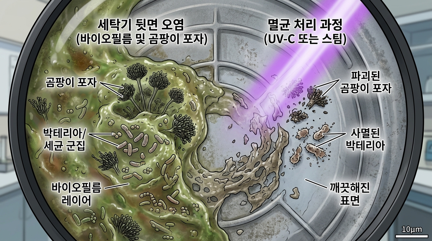 반면 락스(차아염소산나트륨)는 현존하는 가장 강력하고 저렴한 살균제 중 하나입니다. 곰팡이의 세포벽을 직접 파괴하여 냄새의 원인균을 즉각적으로 박멸합니다. 세탁기 냄새가 이미 심각한 수준이라면 과탄산소다보다는 락스를 사용한 '통살균'이 훨씬 효과적입니다. 제조사 매뉴얼에서도 락스 계열의 세정제 사용을 권장하는 경우가 많습니다.