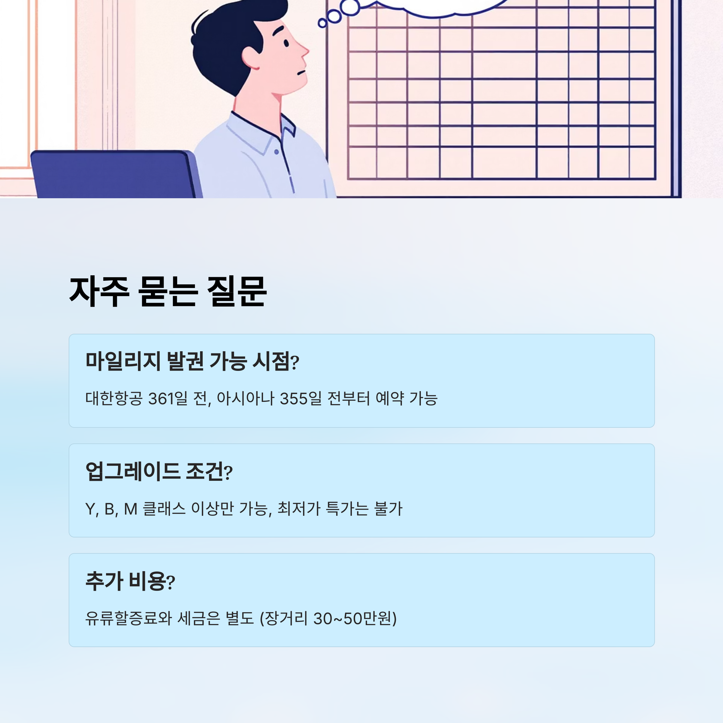 예를 들어 대한항공은 Y, B, M 클래스 이상에서만 업그레이드가 가능하고, 최저가 항공권은 마일리지로 승급이 불가능해요. 이건 아시아나, 아메리칸 항공 등 다른 항공사도 마찬가지예요. 예약 전에 운임 클래스 조건 꼭 확인하세요.