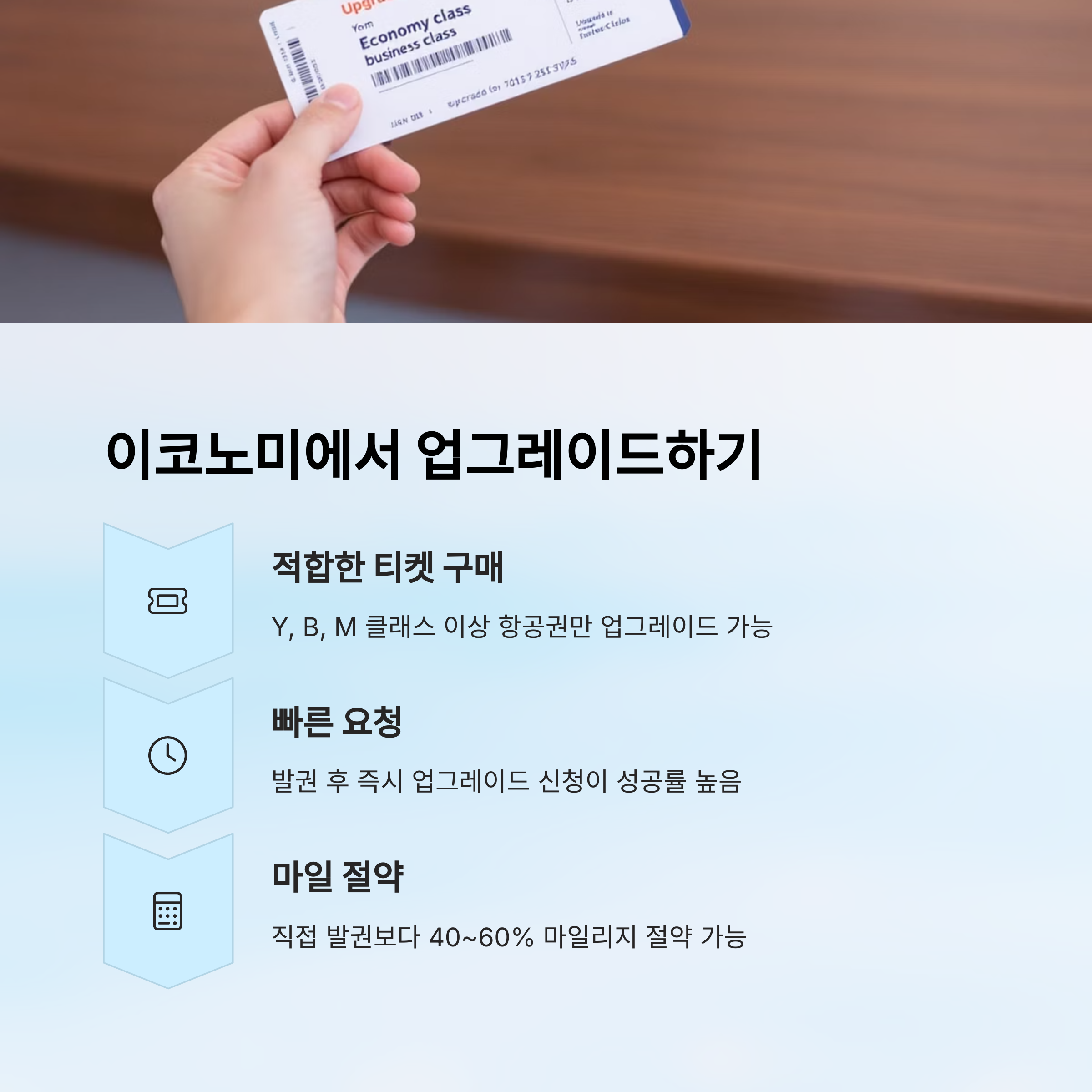 이코노미석 항공권을 먼저 예매한 뒤, 마일리지로 비즈니스석으로 업그레이드하는 것도 아주 인기 있는 방법이에요. 특히 회사 출장이나 경로가 정해진 여행에서 유용하게 쓸 수 있어요. 다만 아무 티켓이나 업그레이드가 가능한 건 아니고, 특정 운임 클래스만 해당돼요.