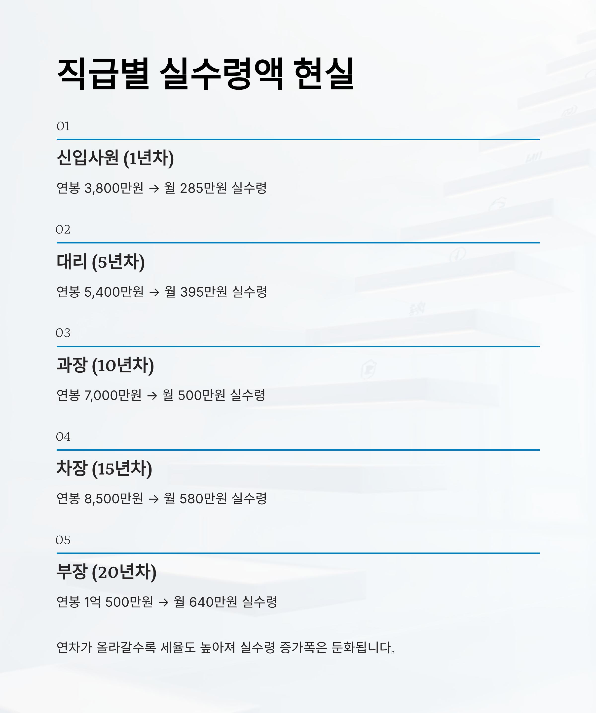 | 차장 (15년차) | 85,000,000 | 5,800,000 | 세율 상승, 실수령 증가폭 둔화 |