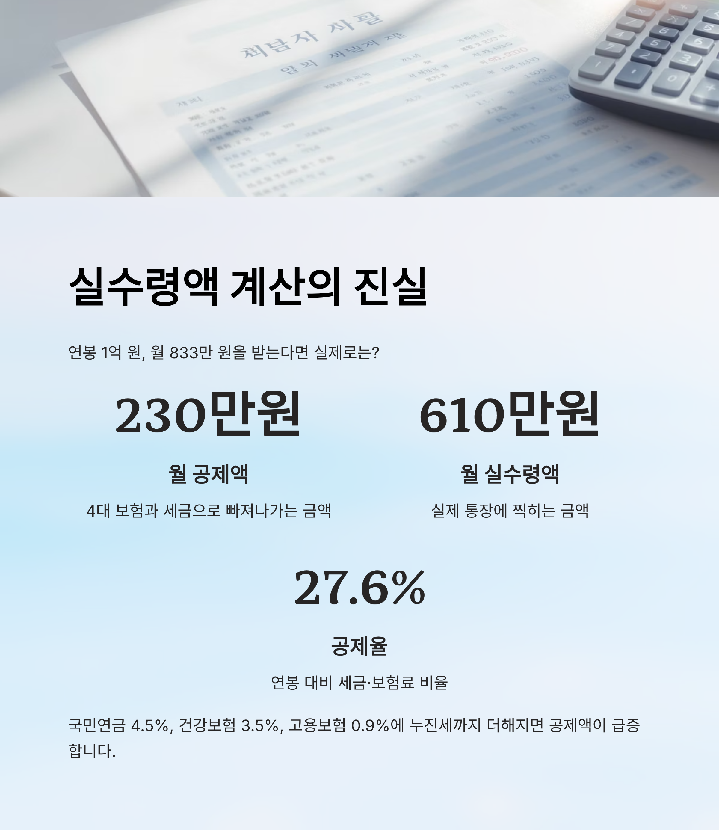 예를 들어 연봉 1억 원을 받는다고 가정할 때, 매월 급여는 약 833만 원이에요. 여기서 국민연금(약 4.5%), 건강보험(약 3.5%), 고용보험(0.9%), 소득세, 지방소득세 등을 빼면 실수령액은 약 600만 원대 중반 정도가 돼요. 즉, 약 230만 원 이상이 빠지는 셈이에요!