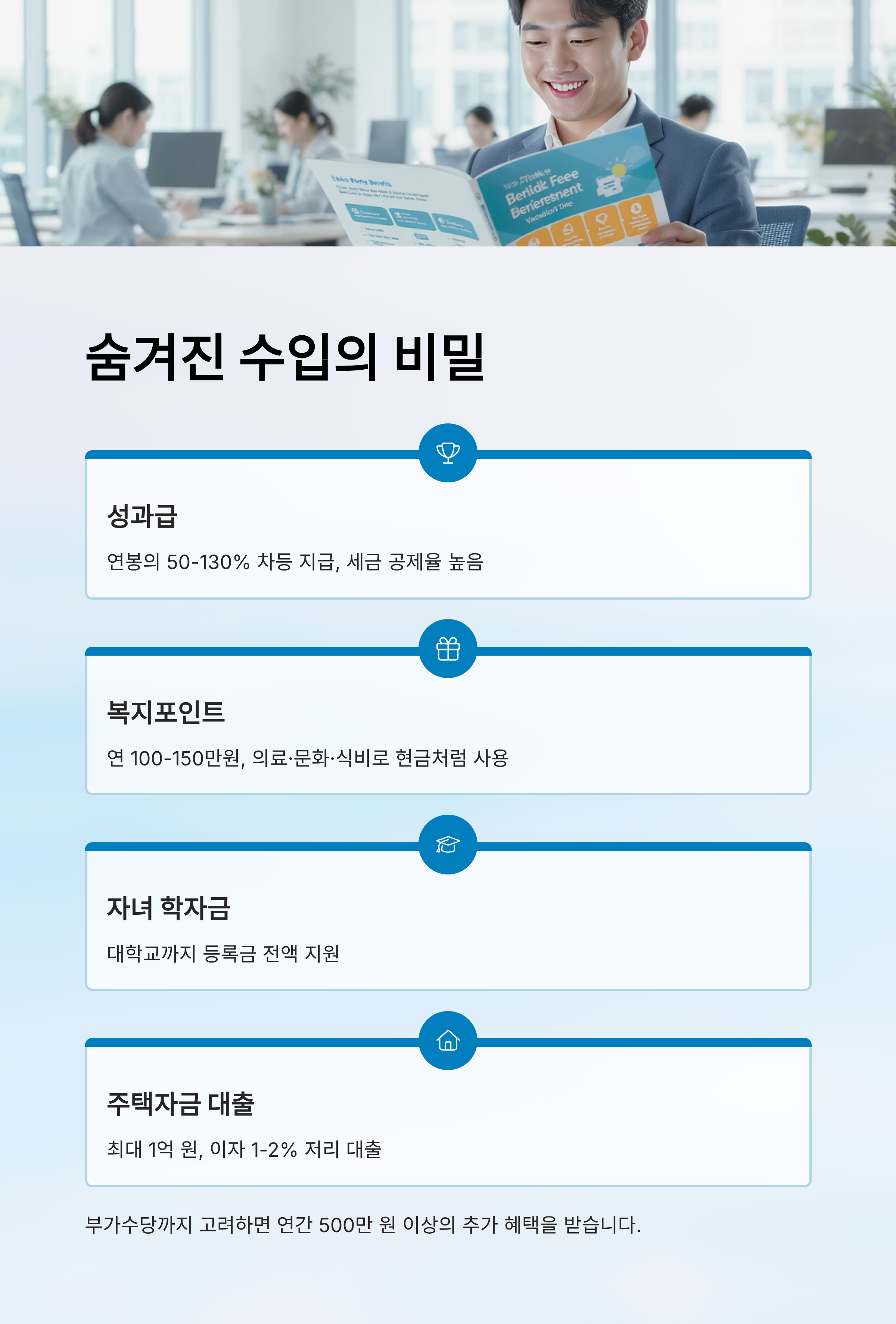 이런 부가수당을 고려하면 연봉 외에 연간 500만 원 이상의 실질적 혜택을 받는 셈이에요. 특히 자녀 학자금 지원이나 복지포인트는 현금처럼 쓸 수 있어서 체감 만족도가 높아요.