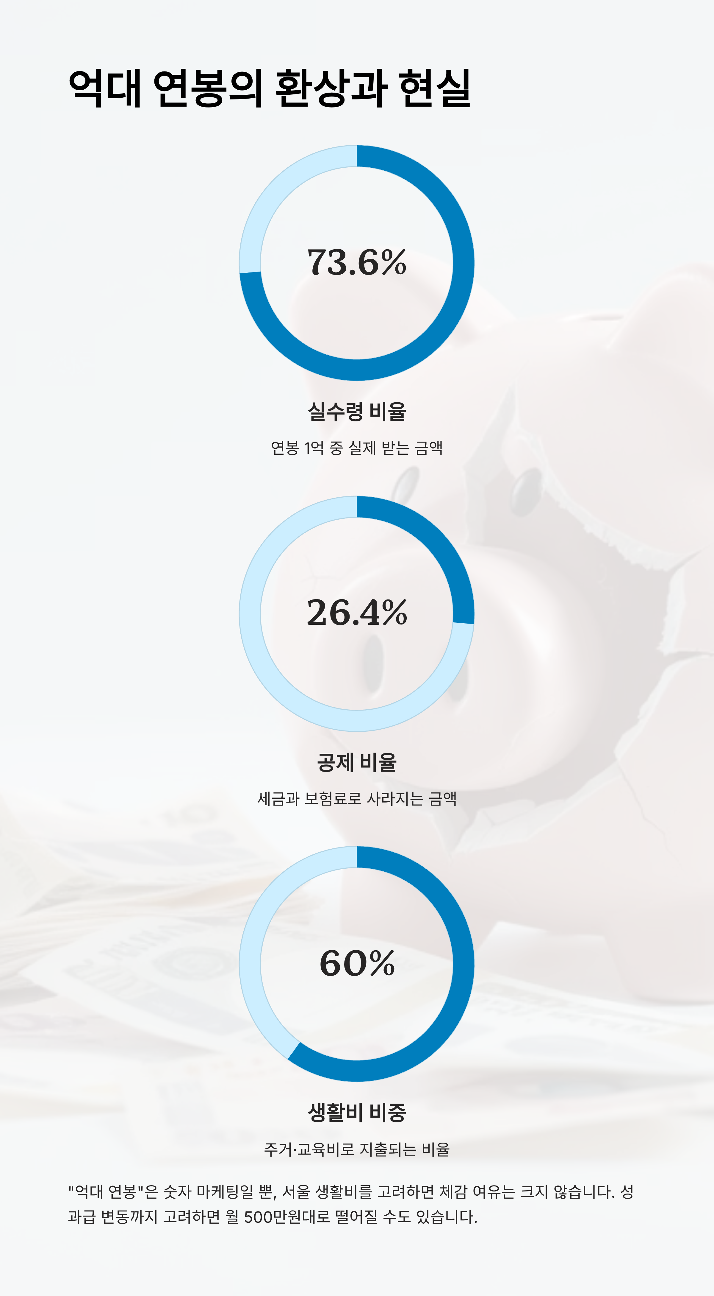 앞서 살펴봤듯, 연봉 1억은 세전 기준이고, 실수령으로 보면 연간 약 7,300만 원, 월 기준으로는 약 610만 원이에요. 이마저도 성과급 비중이 큰 경우, 그 해의 실적에 따라 실수령이 500만 원대로 떨어질 수도 있어요. 결국 “억대 연봉”이란 말은 숫자 마케팅에 불과할 수 있다는 이야기예요.