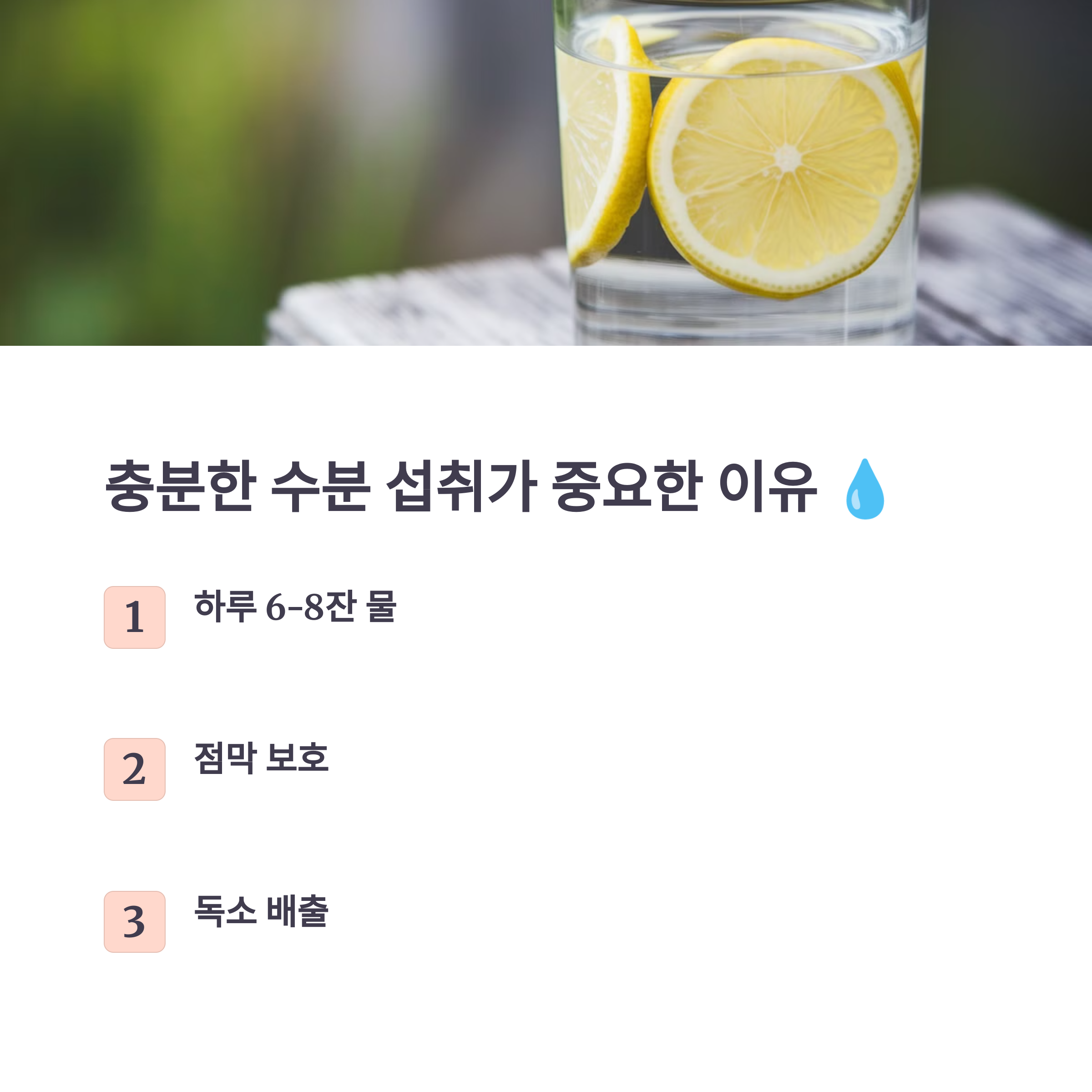 수분 섭취는 단순히 물을 마시는 것뿐 아니라, 수분이 많은 과일(예: 오렌지, 수박)이나 수프와 같은 음식을 통해 보충할 수도 있어요.