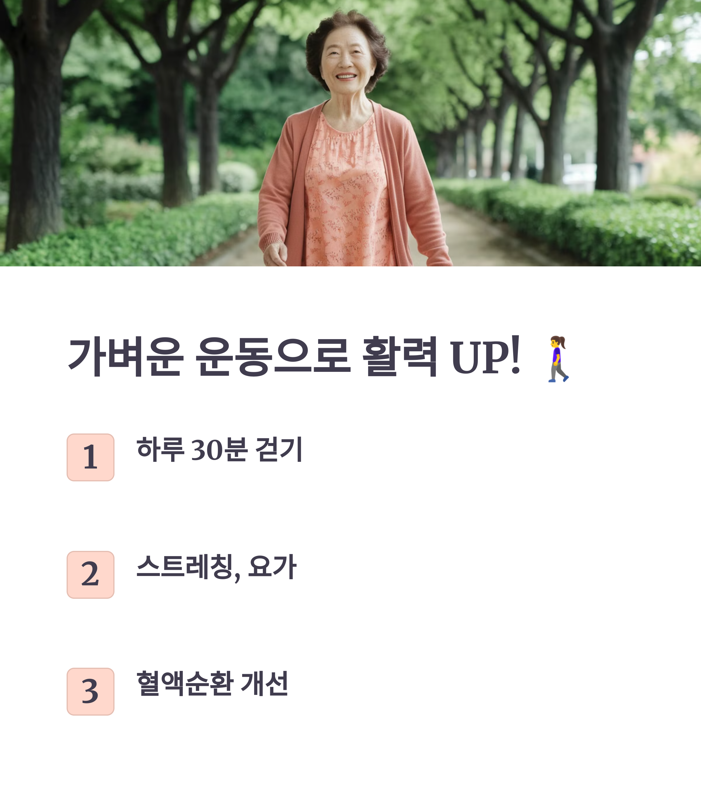 1. 규칙적인 운동: 가벼운 산책이나 요가 같은 적당한 운동은 혈액순환을 돕고, 면역력을 높이는 데 좋아요. 주 3~5회, 하루 20~30분 정도의 운동을 추천해요.