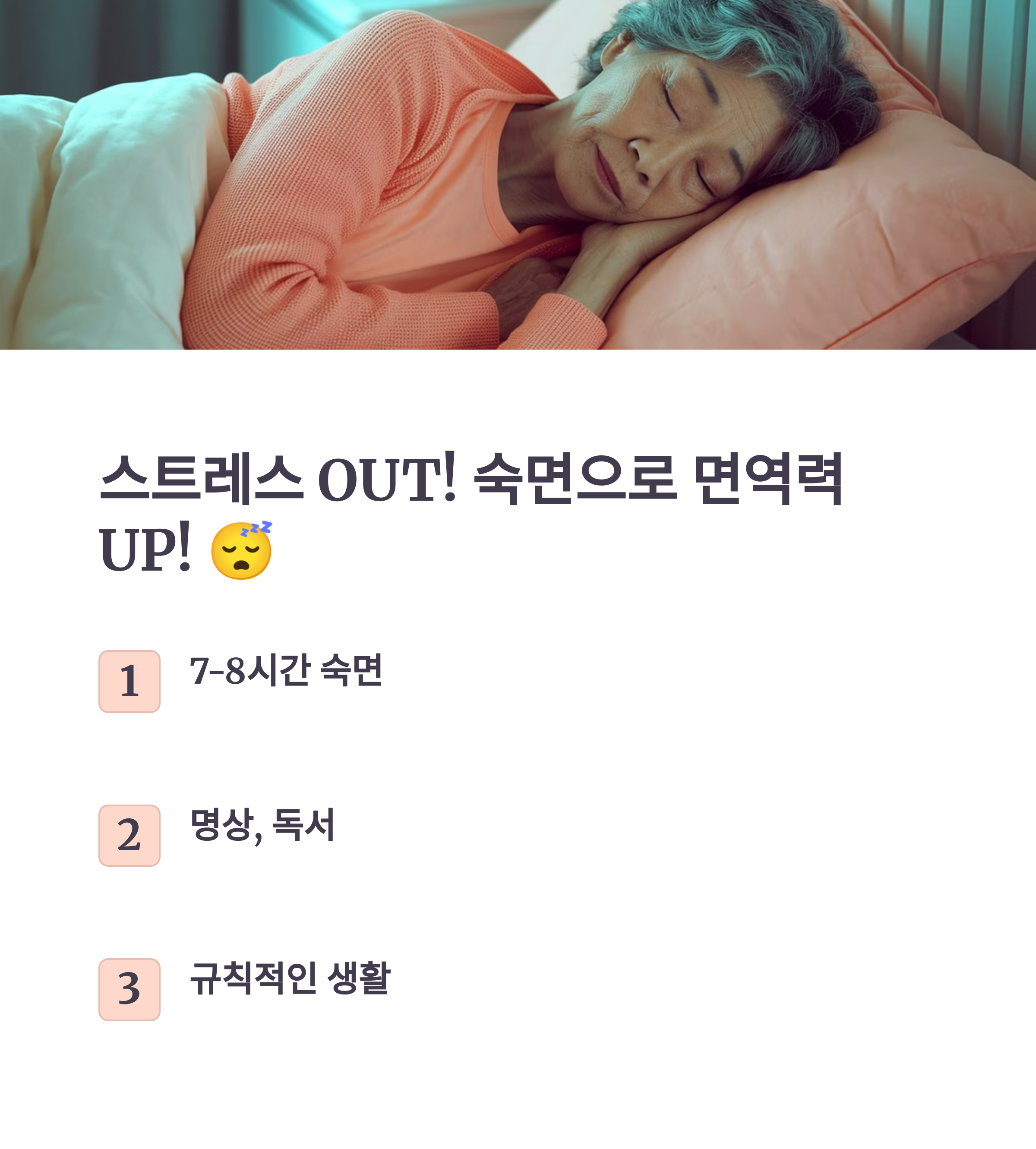 2. 충분한 수면: 어르신들은 종종 수면 부족을 겪기도 해요. 하루 7~8시간의 숙면을 취하도록 돕고, 낮잠을 통해 피로를 푸는 것도 좋아요.