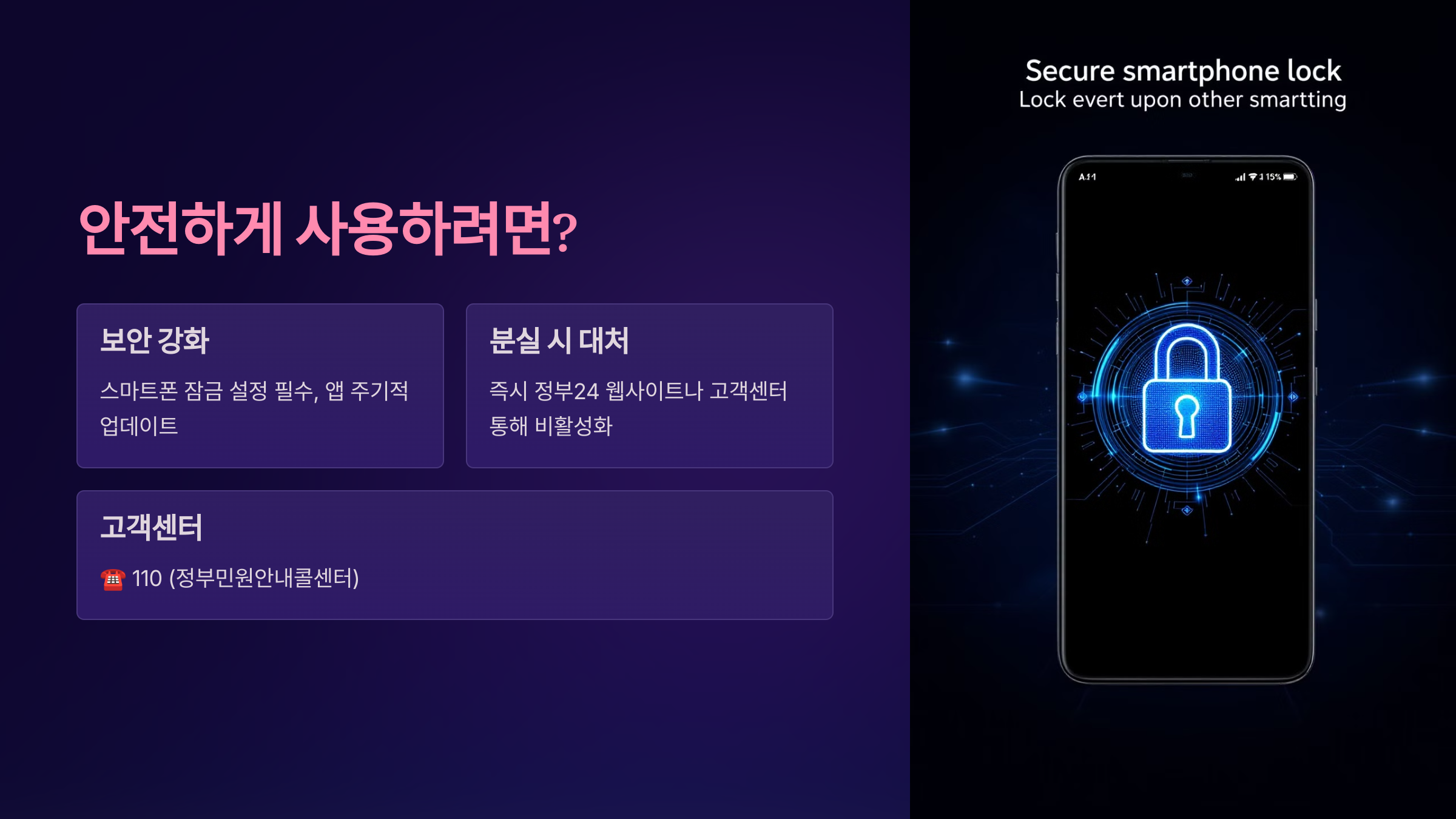 스마트폰을 분실했다면 즉시 정부24 웹사이트나 고객센터를 통해 모바일 주민등록증을 비활성화하세요.