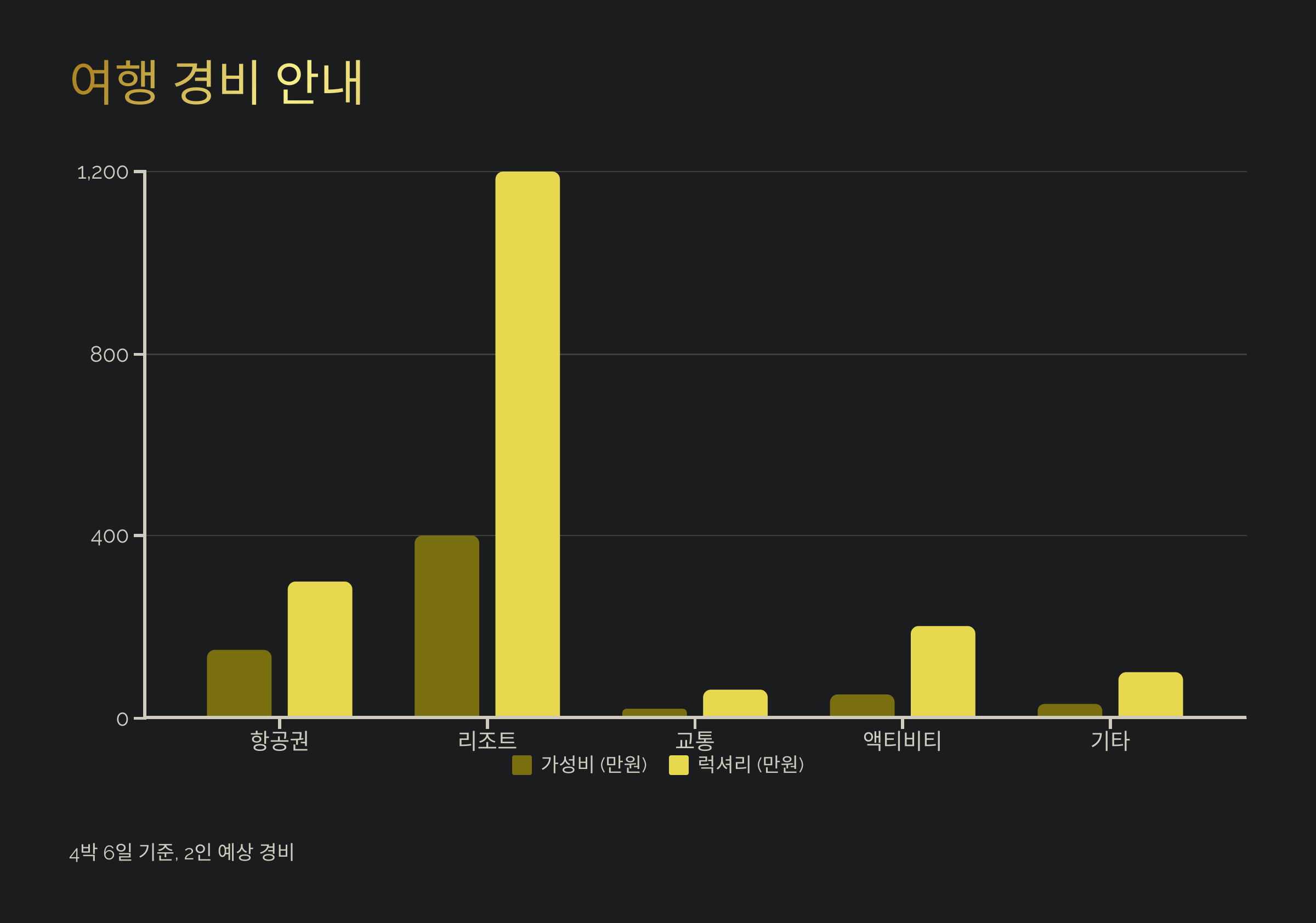 | 리조트 (4박 올인클루시브) | 약 400만 원 | 약 1,200만 원 |