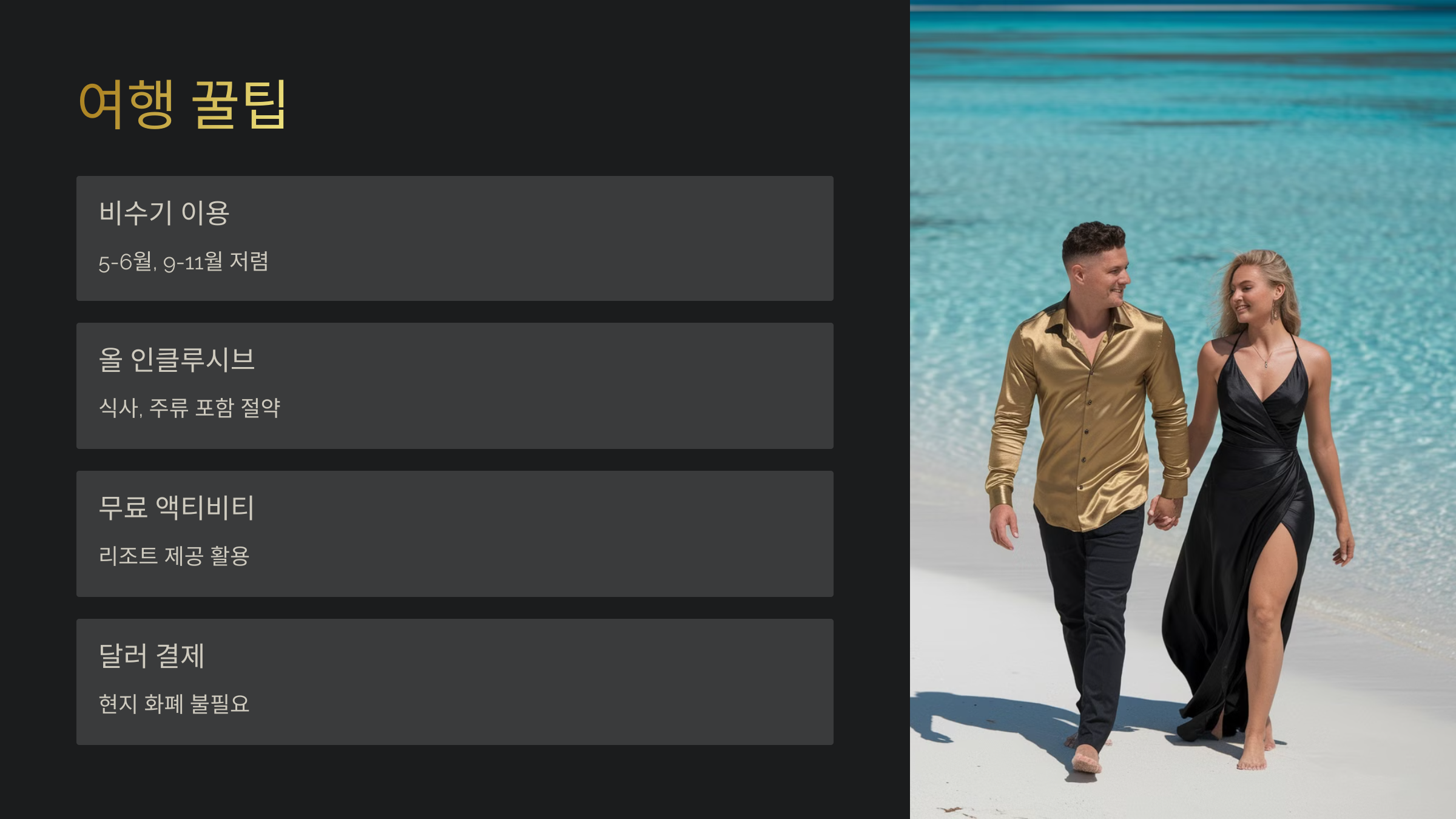 - 리조트는 올 인클루시브 옵션 선택 - 식사 & 주류 포함이라 추가 비용 절감