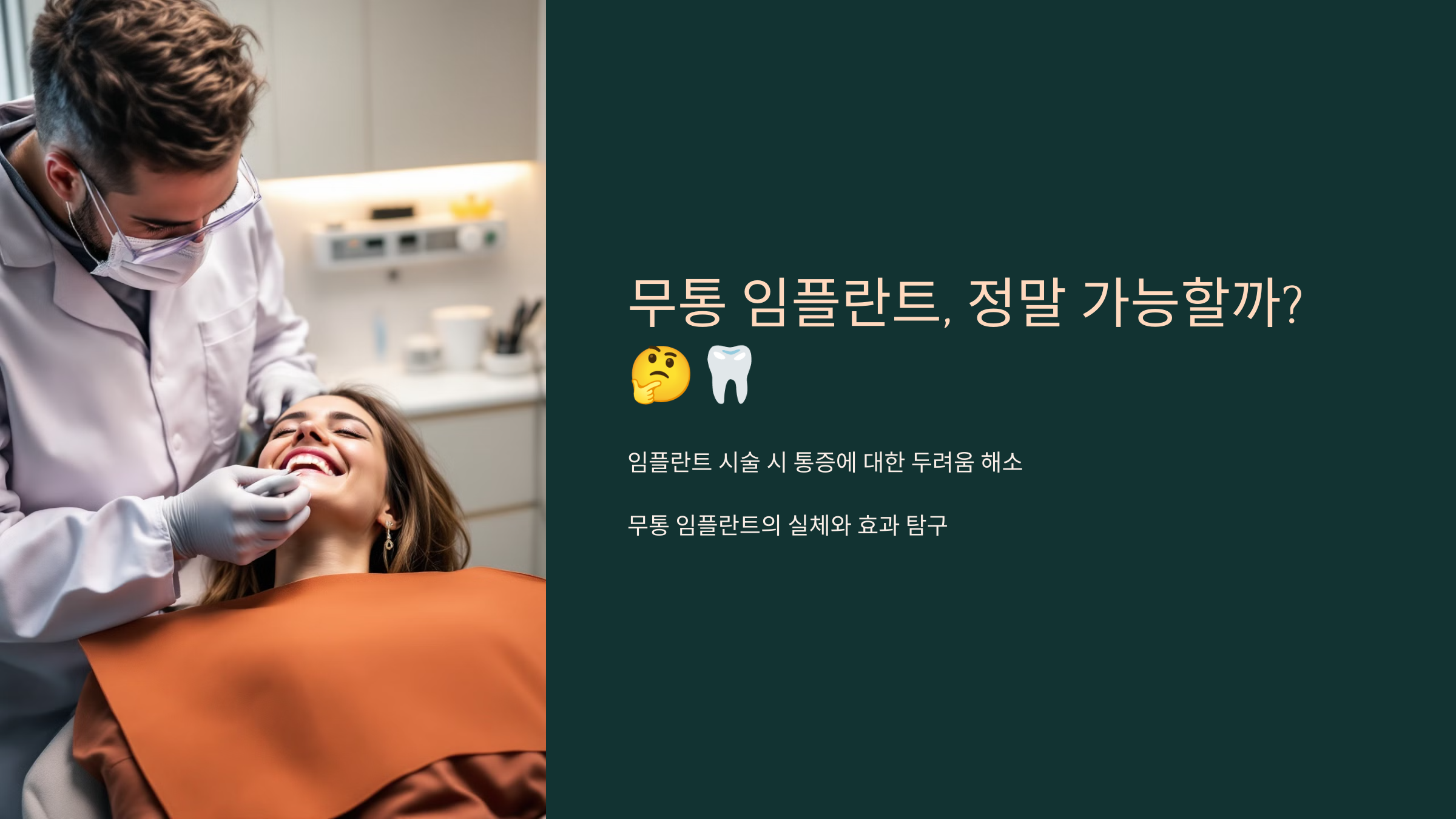 임플란트 시술을 고민하는 분들 중 상당수가 "통증"에 대한 두려움을 가지고 있습니다. 그래서 요즘 "무통 임플란트"라는 단어가 관심을 끌고 있는데요, 정말로 임플란트를 통증 없이 받을 수 있을까요? 이번 글에서는 무통 임플란트의 실체와 효과, 그리고 무통 시술을 받는 방법에 대해 자세히 알아보겠습니다! 😊