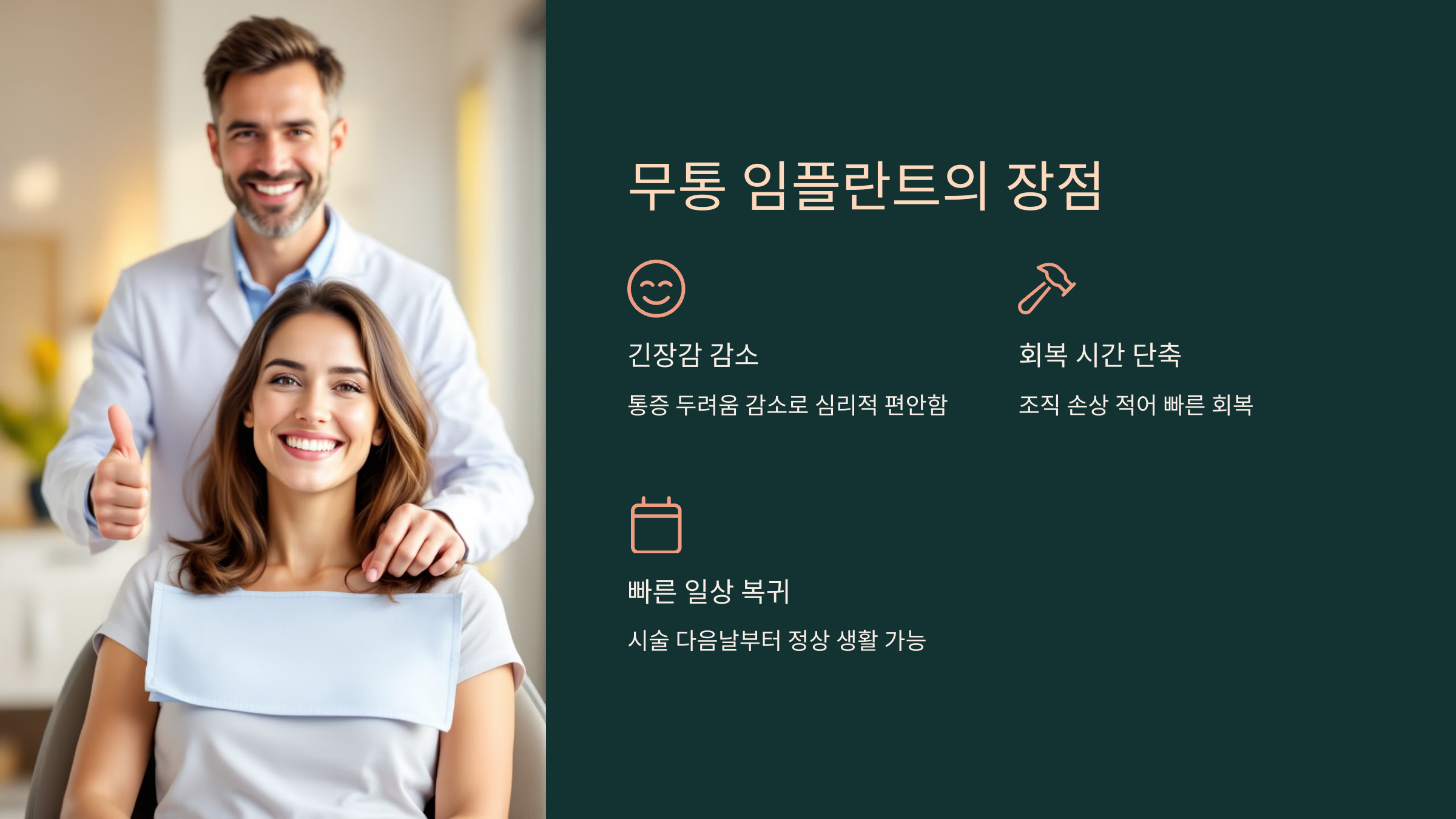 다음은 무통 임플란트를 선택했을 때 얻을 수 있는 주요 장점들입니다: