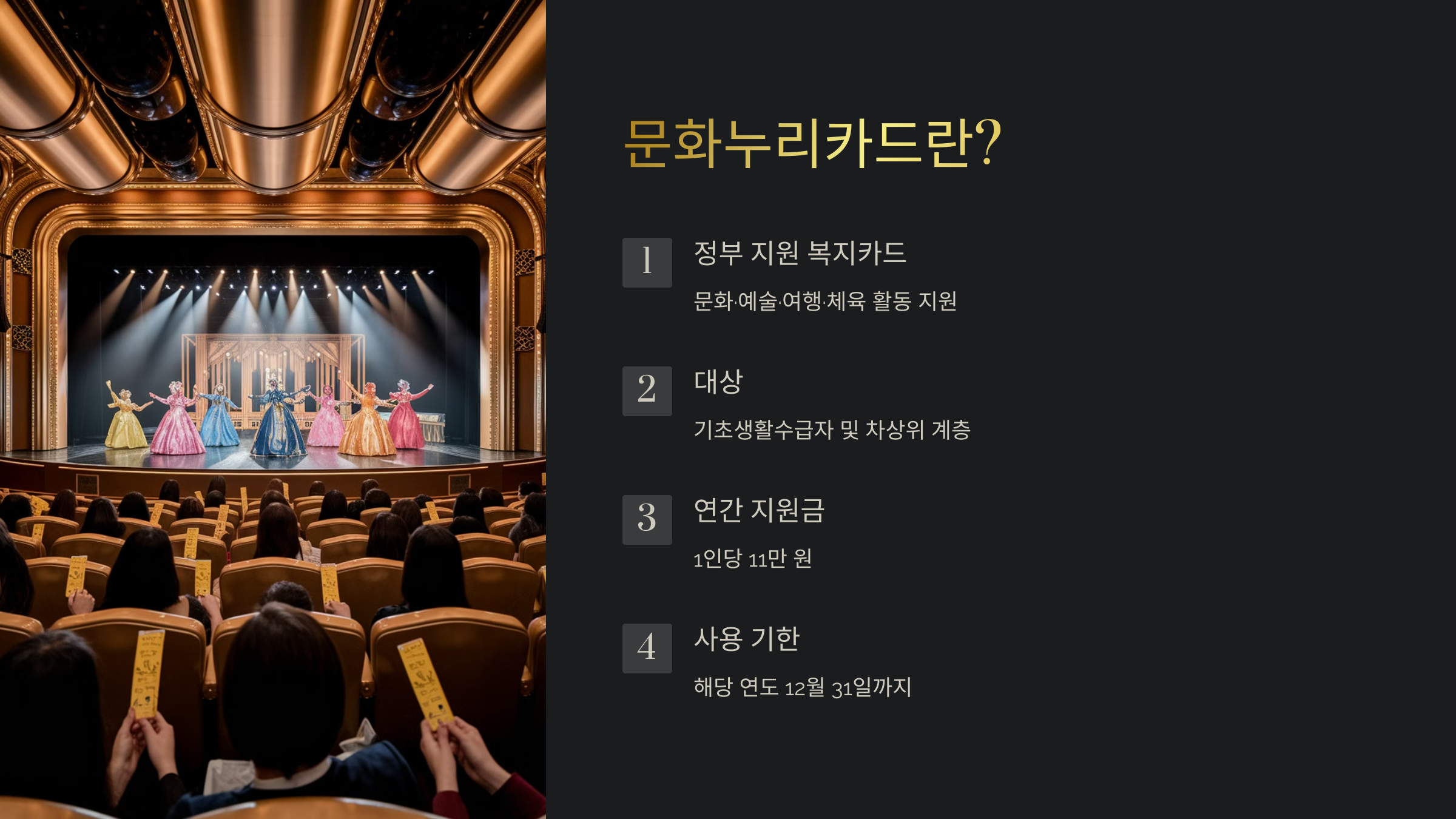 🎭 문화누리카드는 경제적으로 어려운 이들에게 문화·예술·여행·체육 활동을 지원하는 복지카드예요. 이를 통해 공연 관람, 도서 구입, 국내 여행 등 다양한 문화생활을 누릴 수 있어요.