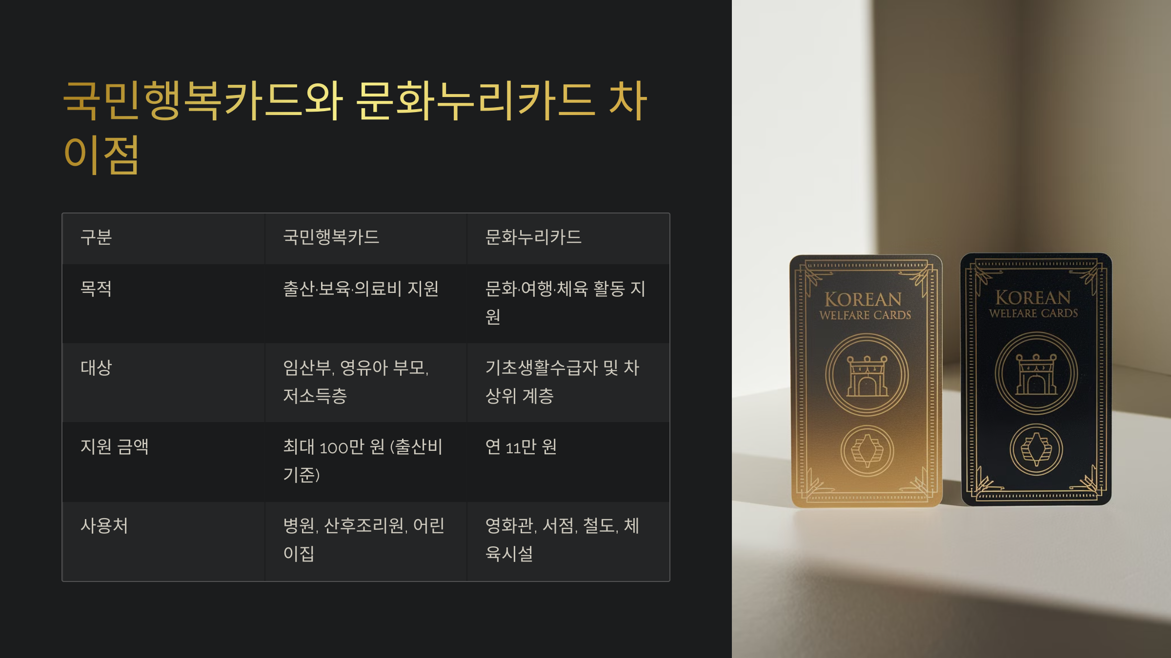 ✔ **한마디로 정리하면?** 국민행복카드는 보육과 의료비 지원에 초점이 맞춰져 있고, 문화누리카드는 문화생활을 즐길 수 있도록 도와주는 카드예요! 자신에게 맞는 카드를 선택해서 활용하면 좋아요. 😉