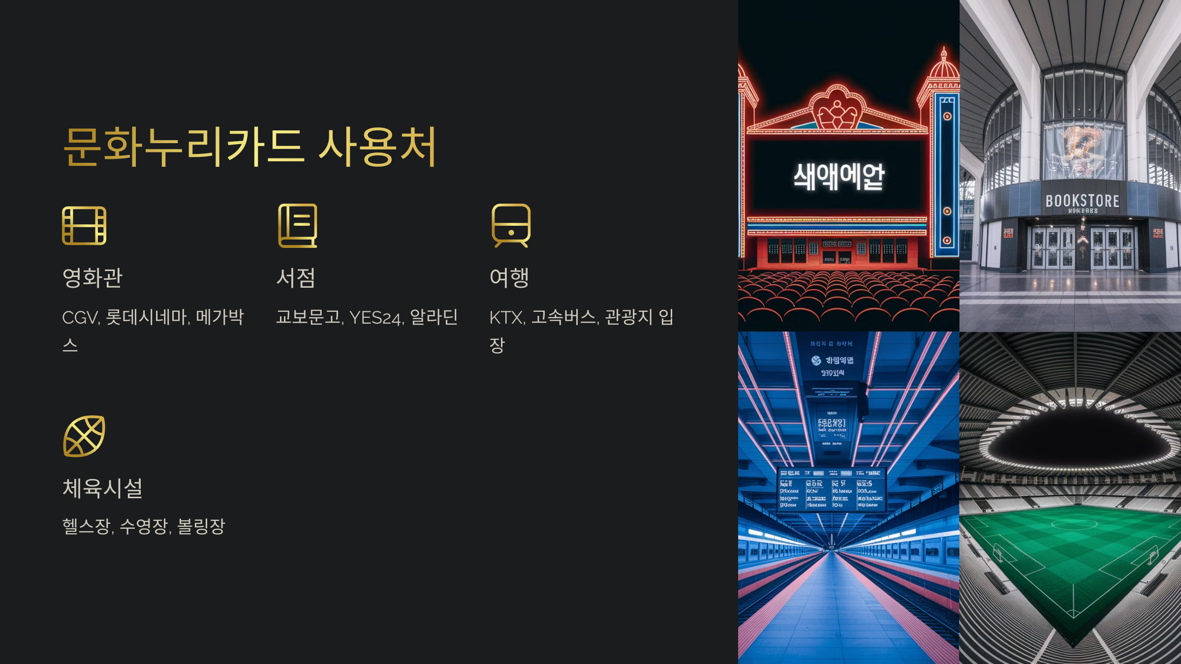 이 카드의 가장 큰 장점은 공연, 영화, 서점, 스포츠 시설, 철도, 고속버스 등 다양한 곳에서 사용할 수 있다는 점이에요. 덕분에 문화 소외 계층도 다양한 경험을 할 수 있죠.