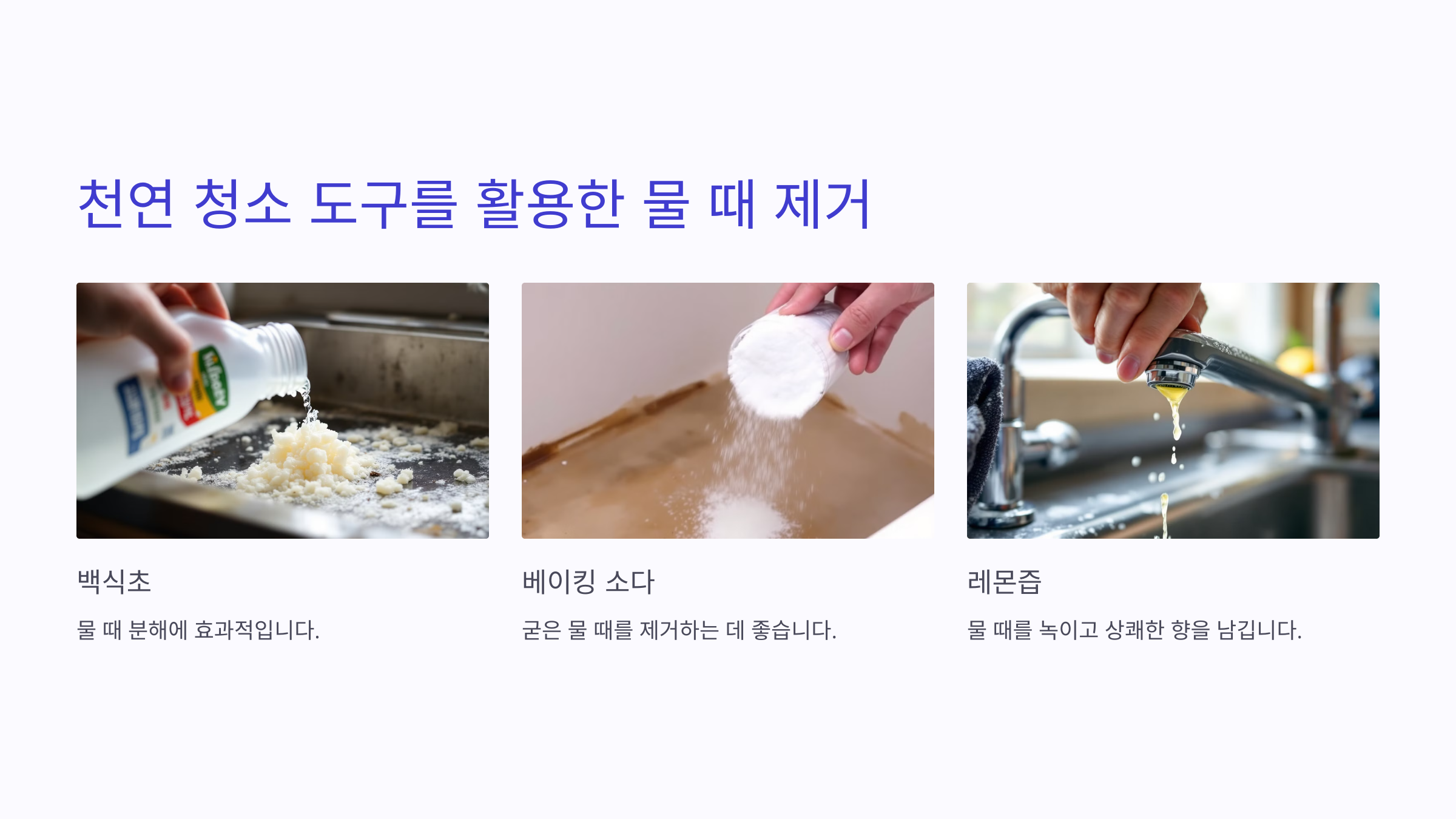 천연 성분을 사용하면 효과적이고 안전한 물 때 제거가 가능합니다. 환경에도 친화적입니다.
