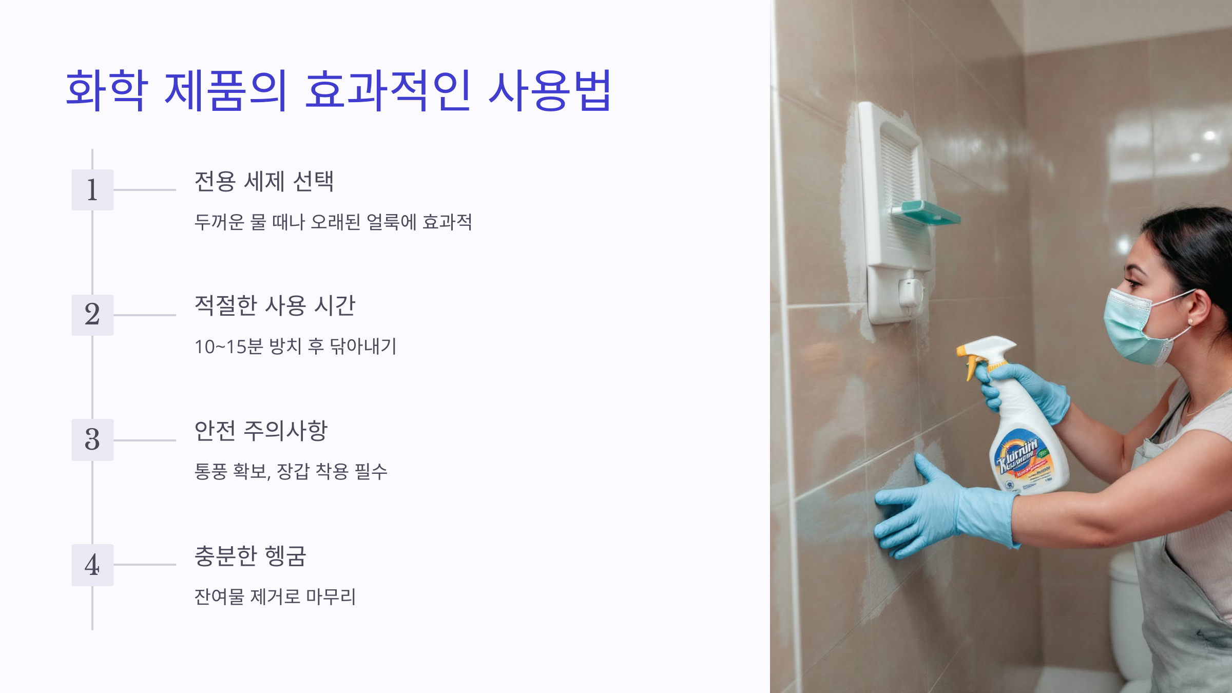 화학 청소 제품은 강력한 효과를 제공합니다. 하지만 올바르게 사용해야 안전하게 물 때를 제거할 수 있습니다.