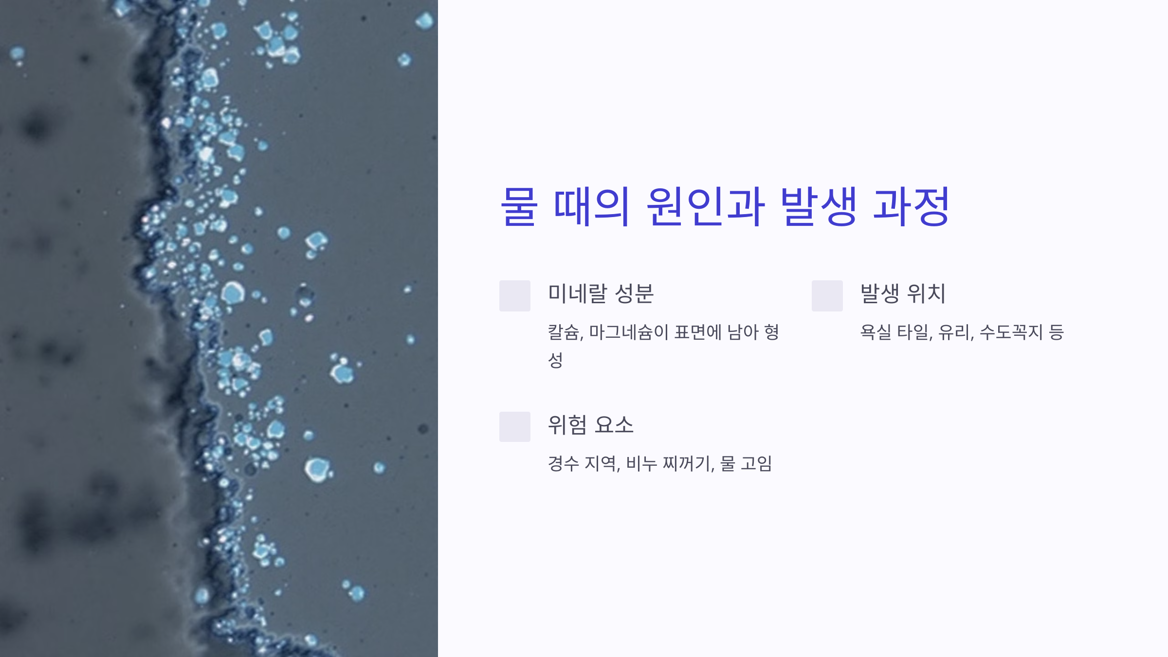 물 때는 물에 포함된 미네랄 성분(주로 칼슘과 마그네슘)이 표면에 남아 형성됩니다. 특히 욕실 타일, 유리, 수도꼭지 등 물과 접촉이 잦은 곳에서 발생합니다.