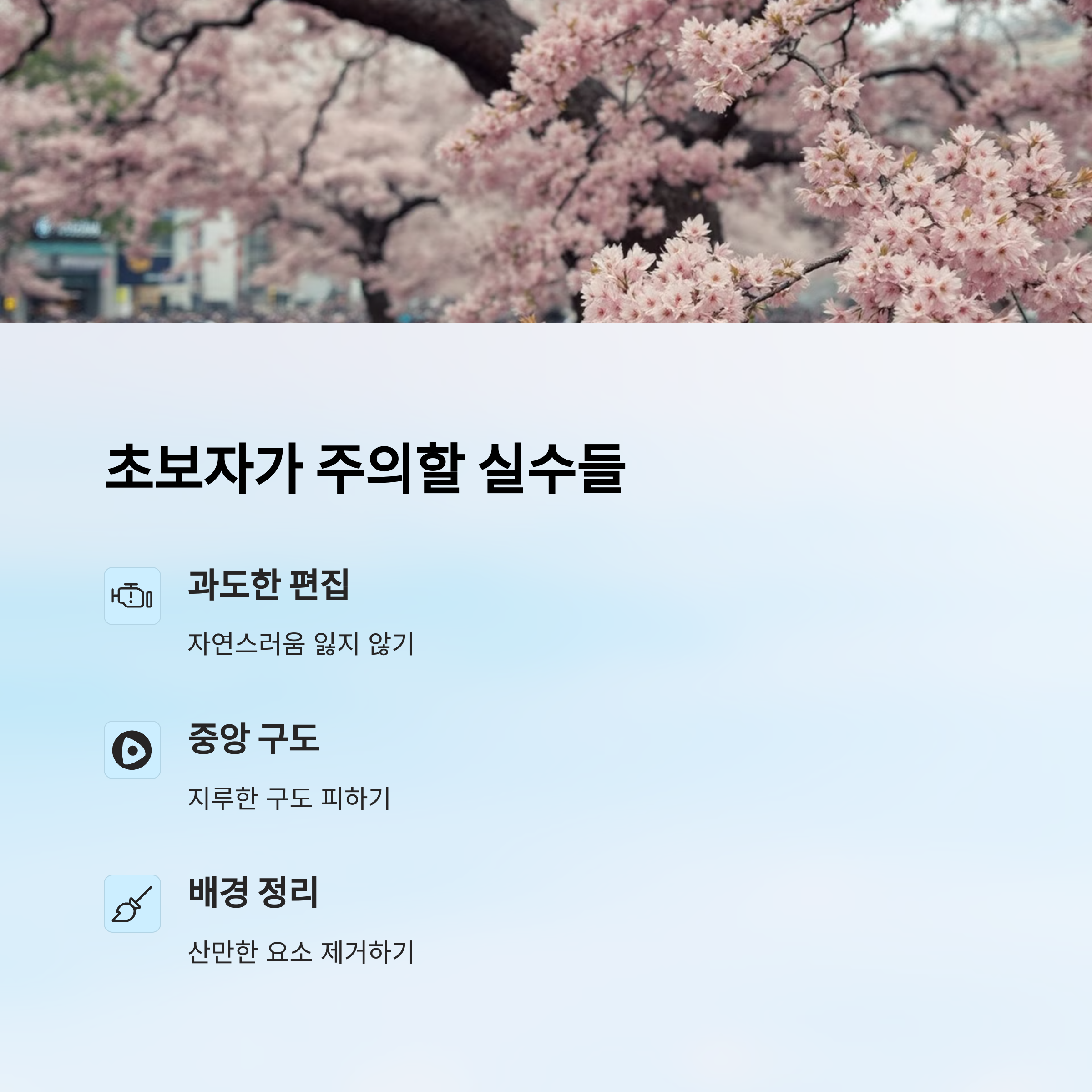 그리고 마지막은 무리하게 보정해서 색감이 어색해지는 실수예요. 벚꽃 본연의 색은 부드럽고 은은하니, 과도한 채도와 필터는 오히려 감성을 해칠 수 있어요. 자연스러움을 살리는 보정이 훨씬 더 멋져요!