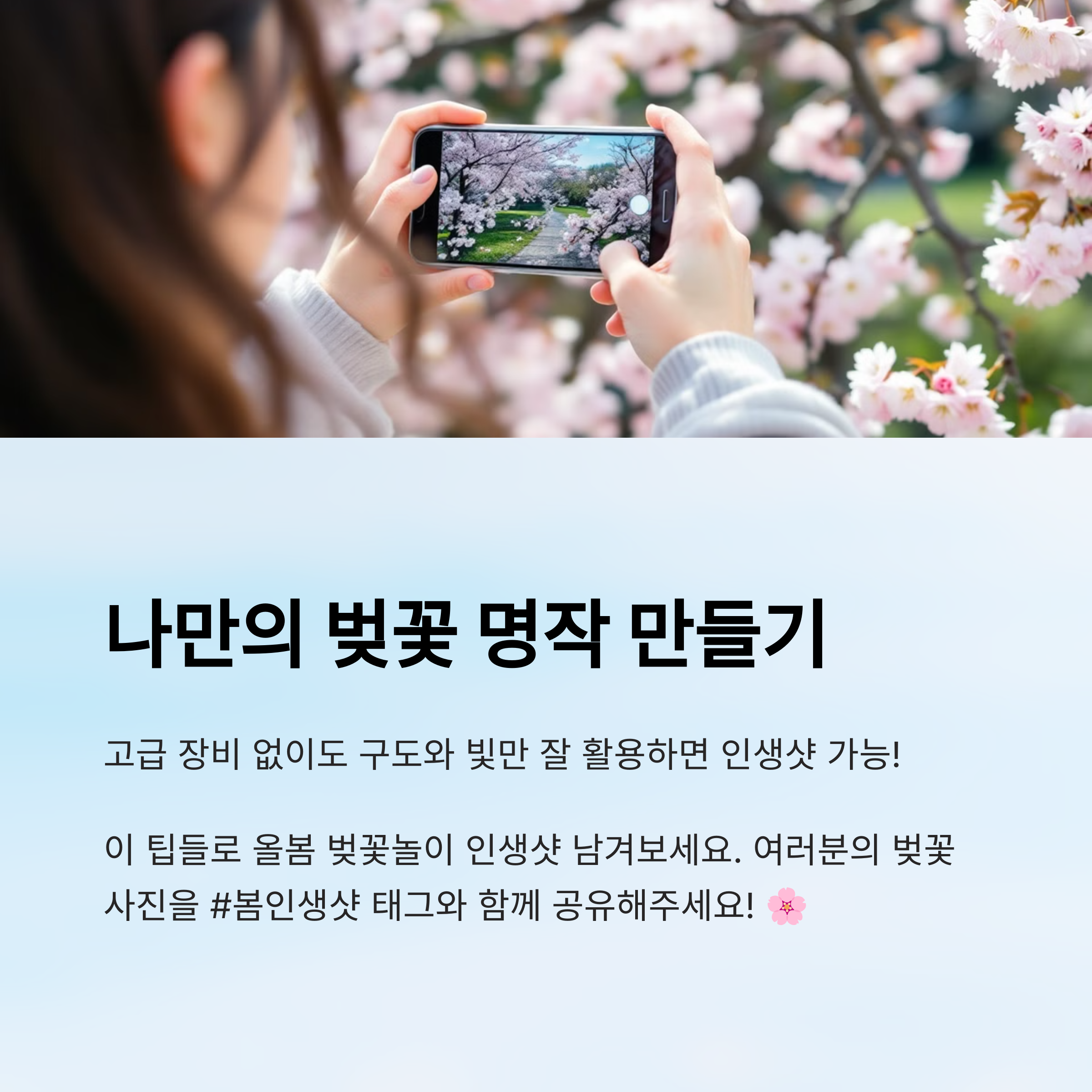시간대를 잘 활용하면 같은 장소도 전혀 다른 느낌으로 표현할 수 있어요. 빛의 변화에 따라 벚꽃의 색감도 달라지는 걸 경험해보면 정말 재밌답니다! 🌞