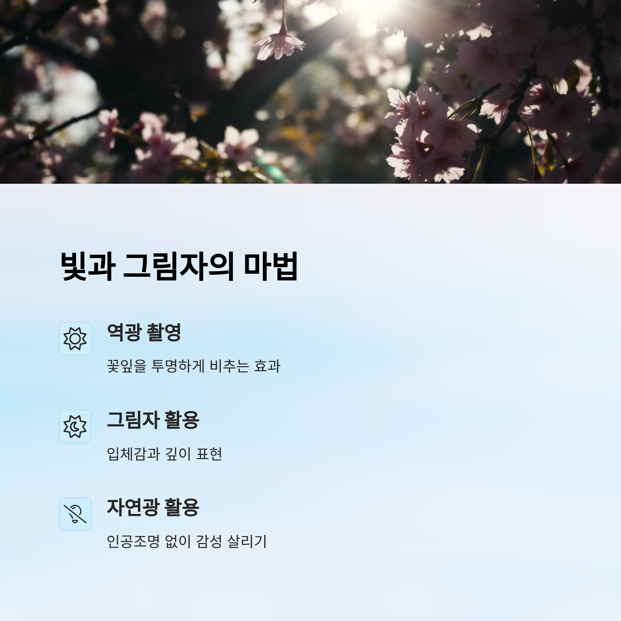 벚꽃사진에서 빛은 감성의 90%를 차지한다고 해도 과언이 아니에요. 자연광을 어떻게 활용하느냐에 따라 사진의 분위기가 완전히 바뀌거든요. 가장 부드럽고 로맨틱한 느낌을 줄 수 있는 건 역시 ‘역광’이에요. 벚꽃 뒤에서 들어오는 햇살이 꽃잎을 비추면 투명한 느낌이 더해져요.